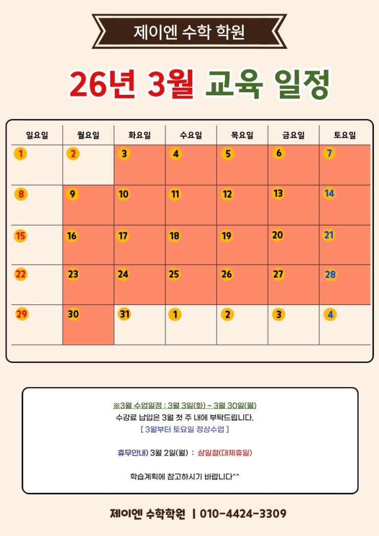 안녕하세요 제이엔 수학 학원 입니다. 다가오는 3월 수업 일정을 안내드립니다. 3월 정규 수업 일정 ▫️기간 : 3월 3일(화) ~ 3월 30일(월) ▫️수업 운영 : 월,수,목 / 화,수,금 (토 : 정상수업) ▫️휴무안내 : 3월1일(월) 삼일절 대체휴일 상담문의 : 010-4424-3309 #신규 #수학 #중등수학 #고등수학 #구미수학학원 #구미구평수학학원 #구미인동수학학원 #구미진평수학학원 #제이엔수학학원 #제이엔 <img src="https://blogthumb.pstatic.net/MjAyNjAyMjZfNzYg/MDAxNzcyMTEwNjA5NDg5.1yK3BGeClJZUeiK8yBaLh9LuXpkItsKrHGIlriQESD4g.G2XjkePCSQpRLOTYdB6ZzeX0WoRytKNINiOc_pPHdTEg.JPEG/26%B3%E2_3%BF%F9_%B1%B3%C0%B0%C0%CF%C1%A4.jpg?type=s3" />