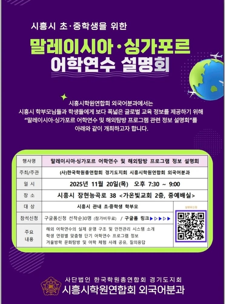 장곡동영어학원, 초등·중등 영어 및 글로벌교육전문 지앤비장현가온학원 원장 Judy입니다. 교육 전문가로서, 아이들의 성장을 위한 '진짜' 정보가 무엇보다 중요하다는 신념을 가지고 있습니다. 특히 우리 아이들에게 넓은 시야와 글로벌 역량을 심어주기 위한 해외 경험은 신중하게 선택해야 합니다. 단순한 관광이나 홍보성 정보가 아닌, 학부모님께 실질적인 정보를 드리기 위해 지난 10월, 저는 시흥시학원연합회 외국어분과 원장님들과 함께 직접 말레이시아 조호바루와 싱가포르의 주요 교육기관을 방문했습니다. 그리고 그 결과를 나누었던 설명회가 많은 학부모님의 관심과 참여 속에 성황리에 마무리되었습니다. 바쁘신 와중....... <img src="https://blogthumb.pstatic.net/MjAyNTEyMDNfMjYy/MDAxNzY0NzI3ODQ2NzAy.20pH6u0O3ODIHbbQeNvXYB3w4q3XRpO2jUvXtRXhPDgg.xApGB4SmxZTFtu0uCHSstnPqpR8Fi2cSL7nmcCtMmAkg.JPEG/900%A3%DFScreenshot%A3%DF20251203%A3%DF105559%A3%DFGallery.jpg?type=s3" />