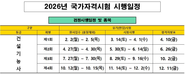 안녕하세요~ 국가대표건설학원입니다. 올해 시험을 다들 잘 치루셨나요?? 올해 아쉽게 떨어지셨거나 준비 못하셨던 분들은 내년에 꼭 합격 하시실 기원합니다. 일정 한번 볼까요? 1년에 총 4번 시험이 이루어지기 때문에 기간 한번 놓치면 몇개월은 기다려야 하기 때문에 꼭 늦지말고 접수하세요~!! 이번 1회차 일정입니다. 작년과 시험은 다를게 없이 비슷하게 이루어지며 접수기간은 약간 앞 당겨 졌어요. 접수 후에 준비할 시간이 더 생기게되었으니 학원선택 잘 하셔서 잘 배우고 합격하시길 바랍니다. 제가 좋은 학원 추천해드릴게요~! 아무리 간단한 자격증이여도 사람 특성에 맞게 따는것이 중요합니다. 누구나 따기 쉬운자격증이지만 누....... <img src="https://blogthumb.pstatic.net/MjAyNTEyMTJfMTYy/MDAxNzY1NTI3NDQzMTQ3.Oxus09YyE7zboa39bHdT_HQYWYNVMLqDLyoUWgZRfzsg.b8BPambngU-YYmt-j-L3SjQwRoku7XjFQkOntIGGQ7Eg.JPEG/2026%B3%E2_%B0%A3%B4%DC%C0%CF%C1%A4.JPG?type=s3" />