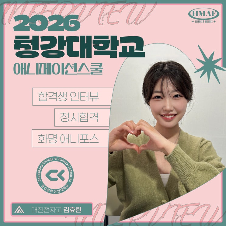 2026 청강대학교 게임콘텐츠스쿨 합격생 인터뷰입니다. 2026 화명애니포스 4기 중앙대, 경기대, 홍익대, 청강대, 상명대, 한성대, 건국대, 공주대, 부산대, 동아대, 경성대, 계명대, 동서대 이 외 다수 대학 합격을 축하합니다! 1️⃣ 합격 & 지원 동기 Q. 먼저 합격을 축하드립니다! 이번에 어느 대학에 합격했나요? 효린 > 이번에 청강문화산업대학교 애니메이션 스쿨에 합격했습니다! Q. 청강대에 지원하게 된 동기는 무엇인가요? 효린 > 청강대는 실무 중심의 커리큘럼이 탄탄하고, 학생들의 작품 퀄리티가 높다는 걸 알고 있었기 때문에 자연스럽게 관심이 가게 됐어요. Q. 청강에 대해 원래 갖고 있던 인상이나 이미지가....... <img src="https://blogthumb.pstatic.net/MjAyNjAyMjZfMSAg/MDAxNzcyMTAyNjczNzgx.3FQ-FxE3LBy4uxh4kFUydNYR4uobZ393N4vEI5GIIowg.VwdsgRQnAV8Usz6hyU4Ugduf8mPivyl4IzwdH87Mfwsg.JPEG/%B1%E8%C8%BF%B8%B0.jpg?type=s3" />