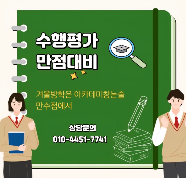 예비 중1들! 이번 겨울 방학 놓치면 수행만점 놓친다! 아카데미창을 붙들어!!! 안녕하세요? 아카데미창논술 만수점입니다. 어느덧 올해를 마감하는 기말고사도 모두 끝났습니다. 우수한 성적들을 받아오고 있어요. 평소 교과 성적을 끌어올리기 위한 공부법을 함께 실천하며 얻어낸 결과이기도 하지만 무엇보다 논술문을 쓰며 읽고 생각하고 해결하는 방법을 익혔기 때문이라고 생각합니다. 특히 수행평가의 경우 수업 중 배운 것을 이해 적용하여 자신의 표현방법으로 써 내는 것이라 단순 암기를 통해 답을 찾는 것과는 차원이 다르죠. 물론 평소 수업 시간에 교과 선생님의 수업을 따라 듣고 선생님이 요구하는 기준에 맞춰 써 내기만 한다면....... <img src="https://blogthumb.pstatic.net/MjAyNTEyMTNfMTE4/MDAxNzY1NjA0MDAzMDU4.uJiMhh8WRukMuYwdbpp1F2PO8QT71ySYpMuKHrTL0eMg.3zMS_lCQS_NYQ5qGN62lvYR1-WZk-OBCdkT0LV3tnJAg.JPEG/900%A3%DFScreenshot%A3%DF20251213%A3%DF143141%A3%DFSamsung_Internet.jpg?type=s3" />