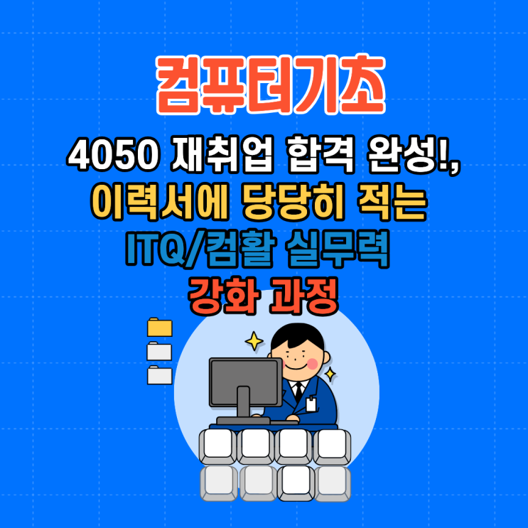 #4050재취업컴퓨터 #ITQ실무자격증 #컴활2급취득 #사무직취업능력 #이력서스펙업 #재취업경쟁력강화 #국비지원컴퓨터학원 #엑셀기본숙달 #한글문서작성법 #취업필수능력 #시니어실무코칭 #컴퓨터활용능력실기 #국민내일배움카드훈련 #취업준비생필수 #취업성공기술 "엑셀 한글 못하면 채용 불가!" 숨기지 말고 능력으로 증명하세요 재취업 면접장에서 가장 자주 듣는 질문은 무엇일까요? "컴퓨터는 어느 정도 다루십니까?"입니다. 이제 사무직이 아닌 현장 관리, 단순 행정 보조 분야에서도 엑셀로 명단을 정리하고, 한글/워드로 보고서를 작성하는 능력은 선택이 아닌 필수가 되었습니다. 저희 국비지원 컴퓨터 과정은 단순....... <img src="https://blogthumb.pstatic.net/MjAyNTEyMTZfNiAg/MDAxNzY1ODYxNjE0Njk4.XO68DOq9pX39soiZNwonVcGTp5boff0XYbYiZXIkezMg.JGZ4-1sy6tQQ_RfK89rmHy7oBgltximeic1aUdmHvQkg.PNG/%C4%C4%C7%BB%C5%CD%B1%E2%C3%CA.png?type=s3" />