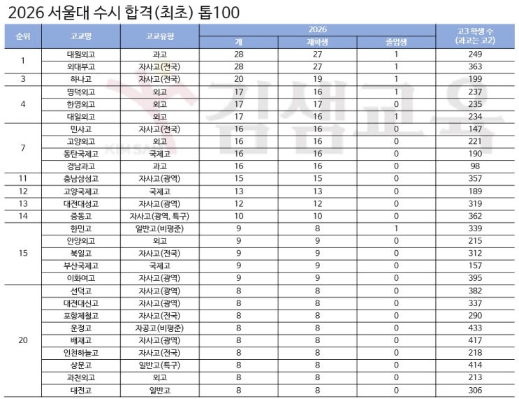 서울대 수시 최초합격자 분석, 외고·자사고 강세 속 영재학교 비중 확대 2026학년도 서울대 수시 최초합격자 조사 결과, 상위 고교 간 경쟁 구도가 비교적 뚜렷하게 나타남. 가장 많은 합격자를 배출한 학교는 대원외고와 외대부고로, 두 학교 모두 총 28명(재학생 27명, 졸업생 1명)의 최초합격자를 기록. 대원외고는 지난해에 이어 선두를 지켰고, 외대부고는 수년만에 다시 정상권에 오름. 이어 하나고(20명), 대일외고·명덕외고·한영외고(각 17명), 민사고, 고양외고, 동탄국제고·경남과학고(각 16명)가 톱10을 형성. 올해 톱 10에는 특목고가 7개교로 여전히 강세를 보였으며, 외고 비중이 가장 큼. 전국단위 자사고 중에서는 민사고·외대부....... <img src="https://blogthumb.pstatic.net/MjAyNTEyMTZfNzcg/MDAxNzY1ODYzNjYwNTU0.QCrur-TtXueKYHtfoSZeYQYcwdLcfQnA7EAbFdKY2A0g.khKAi0sm8WaZfUmSd6Jobf1ceVTsrlUBImE1PkxzfYQg.JPEG/1.jpg?type=s3" />