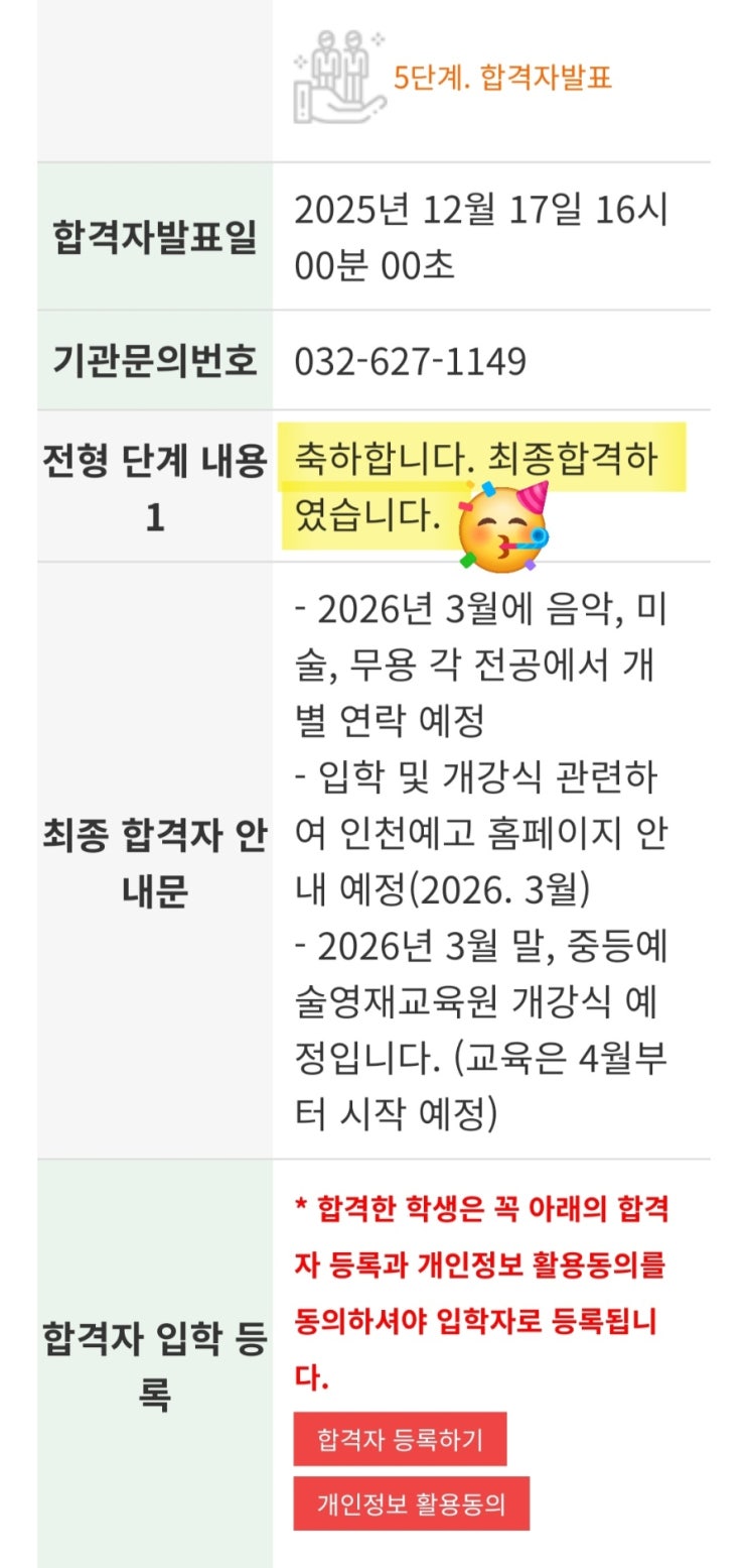안녕하세요, 고원장입니다:) 오늘은 정말 가슴 벅찬 소식을 전해드리려고 합니다! 본원의 6학년 학생이 치열한 경쟁을 뚫고 2026학년도 인천중등예술영재교육원 피아노부문에 당당히 최종 합격하였습니다!!!! 6학년은 중학교 진학을 앞두고 음악적 방향성을 고민하는 아주 중요한 시기죠~ 우리 ㅇ윤이는 저와 함께 기본기부터 곡의 해석까지 하나하나 정교하게 다듬어 왔는데요, 단순히 기교적인 테크닉에만 치중하지 않고, 곡의 정서와 작곡가의 의도를 이해하는 훈련을 반복했던 것이 이번 합격의 결정적인 열쇠가 되었던 것 같아요:) 이화의 전공반은 ✔️맞춤형 실기 전략: 학생의 장점을 극대화할 수 있는 지정곡 및 자유곡 선정 ✔️무대 장....... <img src="https://blogthumb.pstatic.net/MjAyNTEyMThfMTIy/MDAxNzY1OTg2OTY2NjAx.rTP5_Qojyzyvt4XwLhCyDAQhpriZo0w8ou400MrN0Zog.tGaGYcyqhQDLjltjJJ-WgOqxCltkezF1o0T9ZO_V13Ig.JPEG/900%A3%DFScreenshot%A3%DF20251217%A3%DF161444%A3%DFNAVER.jpg?type=s3" />