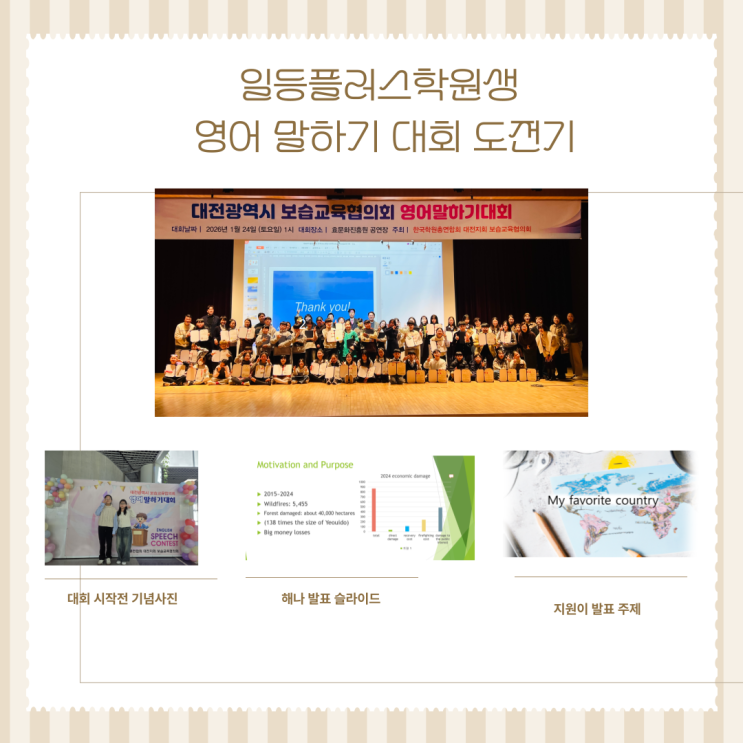 꿈을 향한 당당한 외침! 영어 말하기 대회 도전기 안녕하세요~!^^ 아이들에게 좋은 경험도 제공하려고 노력하는 일등플러스학원장입니다. 지난 1월 24일에 우리 아이들의 마음속에 커다란 성장의 꽃이 피어났습니다. 바로 대전광역시 보습교육협의회 영어 말하기 대회 소식입니다. 교실에서 수줍게 'Hello"라고 인사하면서 영어를 시작했던 아이들이 어느덧 성장하여 커다란 무대 위에서 자신의 생각을 당당히 영어로 펼쳐내는 모습을 보며, 저희 선생님과 부모님들은 뭉클한 감동과 함께 형언할 수 없는 보람을 느꼈답니다. 그 뜨거웠던 도전의 현장과 준비 과정을 여러분과 공유하고자 합니다. "스스로 고른 주제, 진심을 담은....... <img src="https://blogthumb.pstatic.net/MjAyNjAyMjdfNCAg/MDAxNzcyMTkzNzY5MzQ0.xqIG2pUEmA3mOn9SypxhnBuTp4AspTXs-TDN7L7FXjQg.IHRwJnqJQcdDVNlSa-vYdvmjqlHmeF_lYat7h1_VvR0g.PNG/%BD%E6%B3%D7%C0%CF.png?type=s3" />