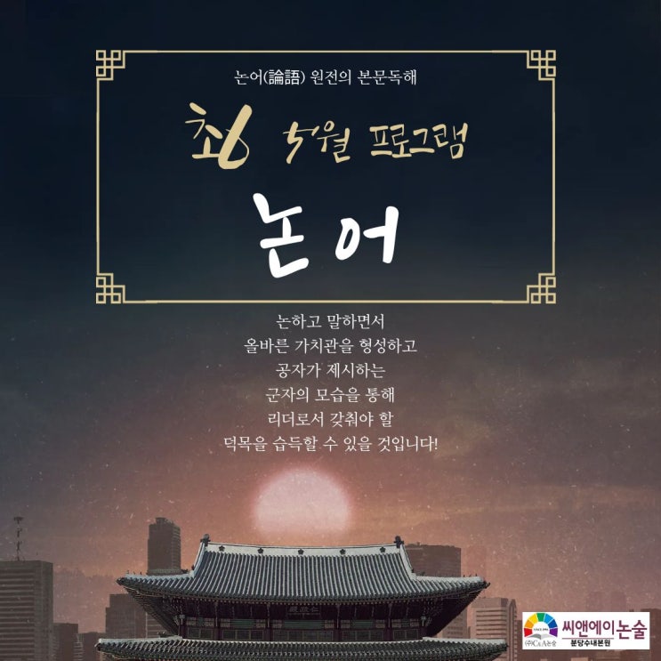 씨앤에이논술 초6 시그니처 프로그램 지혜와 인성을 길러주는 고전 수업 『논어』를 소개합니다 『논어』란 무엇일까요? 『논어』는 고대 중국의 사상가인 공자와 그의 제자들의 대화를 담은 고전으로, 2,500년이 지난 지금까지도 여전히 교육과 삶의 지침이 되고 있는 인문학의 핵심 텍스트입니다. 이 책을 통해 아이들은 단순한 지식이 아닌 ‘생각하는 힘’을 기르게 됩니다. ✔ 인간에 대한 이해 ✔ 사회를 바라보는 시각 ✔ 스스로 질문하는 사고력 이러한 힘이 바로 『논어』가 주는 가장 큰 가치입니다. 왜 지금, 초등학생에게 『논어』일까요? 서양 철학이 소크라테스와 플라톤에서 출발한다면, 동양 철학은 공자에....... <img src="https://blogthumb.pstatic.net/MjAyNjAzMThfMjg0/MDAxNzczODE5NDMwNjE3.QzLW7e15reZ9lsWh3um1QDnqx4ySU_7LpBihB6xs6MIg.4OAUK8d_0MlEb3le4Tc6GBrqcsB_ha4w1anqhbIi8BYg.JPEG/%C1%A6%B8%F1%C0%BB_%C0%D4%B7%C2%C7%D8%C1%D6%BC%BC%BF%E4._%282%29.jpg?type=s3" />