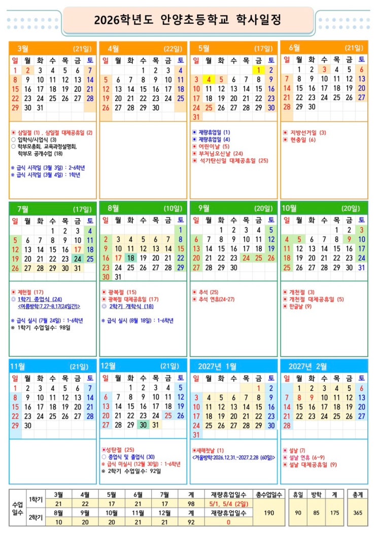 안녕하세요 이나쌤입니다. 긴 겨울방학이 지나고 새 학년, 새 학기를 앞두고 있다 보니 학부모님들 마음도 분주하실 것 같아요. 우리 아이 반 배정은 어떻게 됐을까? 입학식은 몇 시에 하지? 준비물은 따로 안내가 나왔을까? 이것저것 궁금한 게 정말 많으시죠?^^ 그래서 안양초등학교 학부모님들을 위해 안양초등학교 2026학년도와 관련된 내용을 한눈에 정리해 보았습니다. 공지가 올라온 지 얼마 되지 않은 따끈따끈한 최신 정보까지 빠르게 정리했으니 필요하신 부분 편하게 확인해 주세요^^ 1. 2026학년도 학사일정 올해 전체 학사일정이 공지되었습니다. 개학일, 방학 기간, 재량휴업일 등 미리 체크해두시면 한 해 일정 계획 세우시기에 훨....... <img src="https://blogthumb.pstatic.net/MjAyNjAyMjdfMjky/MDAxNzcyMTM1ODIzNDg5.vAGO3ZuwizzE_svowk9CQ2bXYwJm839subTDqGtsktgg.1VNf_u4Tnwi2okMMyQ0sikAiM0sMalGxNpG_nB6VGyEg.JPEG/IMG%A3%DF8243.jpg?type=s3" />