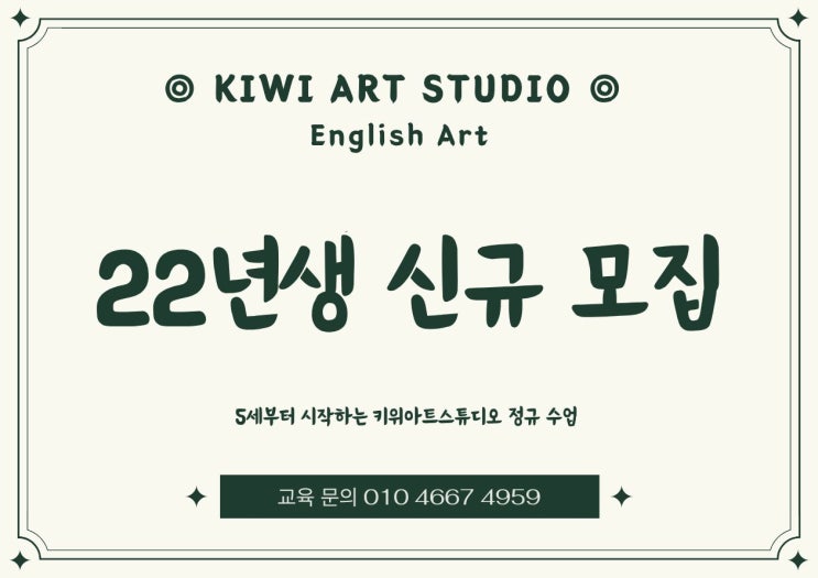Be inspired and explore your creativity! Kia ora 안녕하세요, 키위아트스튜디오입니다 2026년 새해를 맞아 22년생, 5세 친구들을 새롭게 모집합니다 아이의 창의력과 표현력을 키우는 키위아트스튜디오의 정규 잉글리시 아트 클래스는 5세부터 시작 가능합니다 소수정예로 운영되는 수업 특성상 정원이 빠르게 마감될 수 있으니 미리 문의 주세요 정규수업 전 1:1 원데이 유료 체험 수업도 가능하오니, 궁금한 점은 언제든지 편하게 문의해 주시기 바랍니다 감사합니다 교육 문의 01046674959 <img src="https://blogthumb.pstatic.net/MjAyNjAxMjdfMTcx/MDAxNzY5NDkwMzM4OTY0.CKYw1oVrTpdYNxLp1ChD9dsOgYzbTxb2QyRVE48CLlYg.vprfCW9Drrky40pWZIQXGZe0X5HX0AbNnqPkmQolwIUg.JPEG/%C1%A6%B8%F1%C0%BB_%C0%D4%B7%C2%C7%D8%C1%D6%BC%BC%BF%E4_%2811%29.jpg?type=s3" />