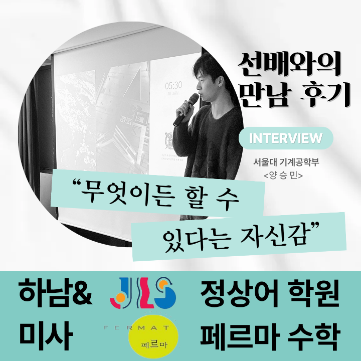 안녕하세요~^^ 꿈을 꾸고 그 꿈을 이루는 곳! 저희 정상어학원 페르마수학 교육 철학을 한마디로 표현해주는 말입니다 ^^ 학부모님은 자녀의 영어나 수학 공부를 위해 정상어학원이나 페르마수학을 선택했는데, 다니다 보니 자꾸 꿈을 찾아보라고 학원에서 설명회도 하고 진로특강도 해줘서 고맙다고 하시곤 하십니다 ♬ 꿈, 진로를 설정하면 목표의식이 생겨 힘든 공부도 이겨내고, 입시에서 유리한 측면이 있어서 원장님은 입시 교육을 매우 중요하게 생각하시고 있으신데요~ ^^ 오늘은 지난 토요일에 있었던 양승민 서울대 선배와의 만남 후기를 준비했습니다. 1.24(토)은 하남분원에서, 1.31(토)은 미사분원에서 선배의 진로특강이 진행되었....... <img src="https://blogthumb.pstatic.net/MjAyNjAyMDRfMTkx/MDAxNzcwMTc2ODEzOTI5.YykOYGlRhj2z6LmJDtO7EH1SW1TU9VNCL-1wvCfRyU0g.eAtZj_E2SAsR1imp-uqG5TJLIjbPdaiO_P6uwklfpDwg.PNG/%BC%F6%BB%F3_%C7%C3%B7%A7%C6%FB_%BE%E7%BD%C4-_%BA%B9%BB%E7%BA%BB.png?type=s3" />