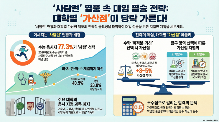 '사탐런' 대세라지만…주의할 점 1. '사탐런' 현황 및 확산 배경 급증하는 사탐 선택자: 2026학년도 수능에서 사탐 과목을 1개 이상 선택한 수험생은 **77.3%**에 달하며, 차기 수능에서는 80%를 넘길 것으로 전망됩니다. 자연계열 상위권 가세: 의대(9.3%), 수의대(40.5%), 약대(23.8%) 등 전통적으로 과탐 응시가 필수였던 의약학 계열 지원자들 사이에서도 사탐 선택 비중이 높아지고 있습니다. 배경: 2025학년도부터 주요 대학들이 자연계열 모집 단위에서 수능 응시 지정 과목(미적분·기하, 과학탐구)을 폐지하면서 사탐 응시가 전략적 선택지로 부상했습니다. 2. 대학별 응시 지정 과목 현황 지정 과목 폐지 대학: 건....... <img src="https://blogthumb.pstatic.net/MjAyNjAyMjhfMjcz/MDAxNzcyMjU2NjQzMzQy.iAbnaeUx7m7ElsL2HHj4Mc-QC5zPl4j1-TSE4_ExF6Eg.Klgpr7U3zvwC2XcsAFkt5_kqZIgPJmMOEpUDdNszH1Mg.PNG/unnamed_%282%29.png?type=s3" />