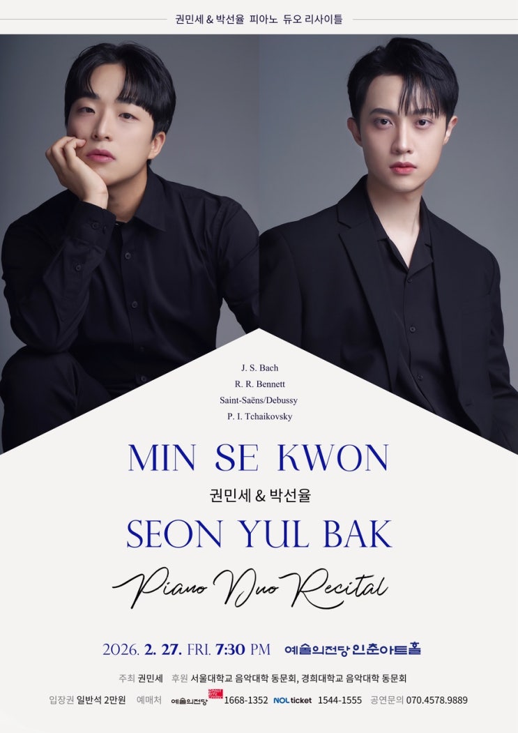 안녕하세요. 2월 27일에 예술의전당 인춘아트홀에서 오래된 친구와 듀오 리사이틀을 합니다! 기획사를 끼지않고 혼자 모든걸 진행하다보니 참 쉽지않네요다른 사설 홀들이면 쉽게 진행이될텐데 예술의전당이라서요ㅎㅎ 대관신청..대관진행절차..공연홍보물제작..공연등록검인..티켓판매등록..등등 당일 진행부터 연주까지 무사히 마칠수 있기를 바라며 많은 관심 부탁드립니다!! <권민세&박선율 피아노 듀오 리사이틀> -일시 : 2026년 2월 27일 금요일 저녁 7시 30분 -장소 : 예술의전당 인춘아트홀 -예매처 : 예술의전당, 놀티켓 -문의 : 070-4578-9889 <프로그램> J. S. Bach - Jesu, Joy of Man's Desiring (from Ca....... <img src="https://blogthumb.pstatic.net/MjAyNjAyMThfMjMg/MDAxNzcxMzc1MDI1ODAy.7bo-9vROm_Lcws4RCJMx2YOH8bZyYcNG2IQA7bQND_og.x0oZnE3vymqnjVTtUaYQ9Gwt3rSmkszHhx1vY4M_ZVIg.JPEG/IMG%A3%DF5059.JPG?type=s3" />
