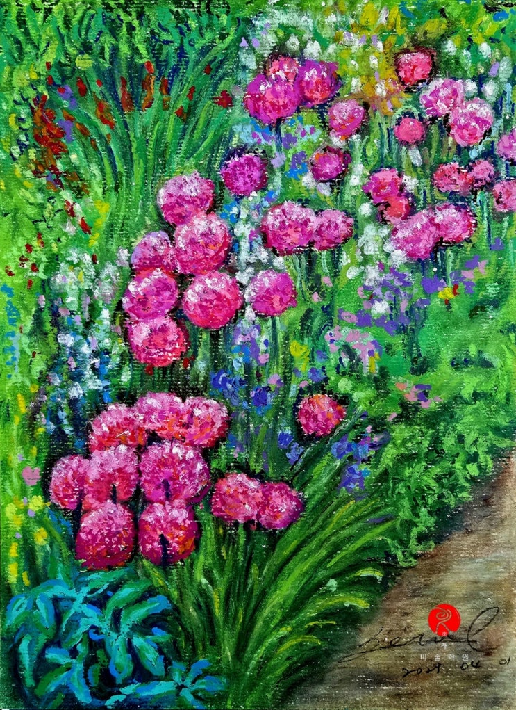 동그란 핑크빛 꽃, 알리움을 오일파스텔로 표현하는 즐거움ㅡ대치동 래미술학원