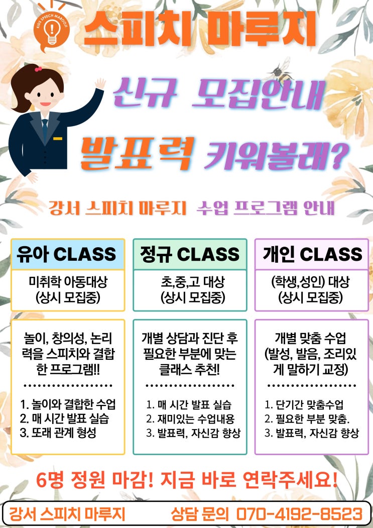 안녕하세요~ 강서 스피치 학원의 대표주자! 강서 스피치 마루지입니다~^^ 새 학기를 맞아 우리 친구들 새로운 마음으로 새로운 도전을 하고 있는데요~ 강서 스피치 마루지에도 많은 친구들이 스피치를 성장시키고 있습니다. 그래서 준비한 강서 스피치 마루지 3월 모집 안내입니다! 유아 클래스(6,7세) 목요일 4시 클래스 추가 모집 중! 금요일 5시 클래스 추가 모집 중! 신규 클래스 추가 개설 가능! 우리 막내! 귀염둥이들~ 너무 즐겁게 열심히 자신감 쑥쑥~~ 발표력 업 업~~ 사회성 굿굿~~ 성장시키고 있답니다! 예비 초 클래스 (8세) 목요일 6시 클래스 마감! 토요일 2시 클래스 마감! 토요일 10시 클래스 추가 모집 중~ 신규 클래스 추가 개....... <img src="https://blogthumb.pstatic.net/MjAyNjAyMjZfMjQw/MDAxNzcyMTE1MDk0NDQz.QvLYpgSYPq60I8tLqrLVCUp-sarXRd1INVspQ-6NJ2kg.hsXD_BnJdzMMv1H4ANB-ub87pRtMDGtkbsYmrSuwR5Ag.JPEG/%B0%AD%BC%AD%B8%B6%B7%E7%C1%F6%BC%F6%BE%F7%BE%C8%B3%BB%B3%BB-001.jpg?type=s3" />