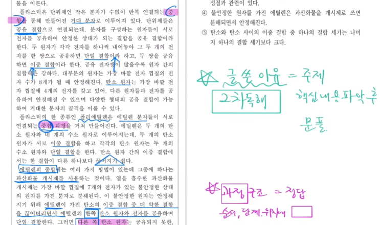 안녕하세요. 대치동 20년 고수, 국어 성적 향상의 달인 원어비 국어오름 하진우 원장입니다. 과학기술 지문이 나오면 탄소 결합 등의 복잡한 용어에 압도되어 지레 겁을 먹는 학생들이 많습니다. 하지만 과학기술 지문이 어렵게 느껴지는 진짜 이유는 용어 때문이 아니라, 글의 '목적'을 놓치기 때문입니다. 오늘 25학년도 6평 지문을 통해, 5등급도 1등급으로 만드는 고득점 실전 독해 원칙을 정리해 드립니다. "복잡한 탄소 결합에 매몰되지 마십시오. '중합'이라는 핵심 키워드를 잡고 끝까지 달려야 길을 잃지 않습니다." 1. 하진우 원장의 과학기술 지문 독해 원칙 [원칙 1: 개별 용어보다 '핵심 키워드....... <img src="https://blogthumb.pstatic.net/MjAyNjAzMTFfNjkg/MDAxNzczMjMwMTc1NzY3.kkLBs3OP14_Imck4SKce64oJnID3rFbFaESjgtVpSeQg.hqRzRIodyMuVcWAbeZDaIj8NcuGWY4ld7hrORlFmH8Eg.PNG/25%C7%D0%B3%E2%B5%B5_6%C6%F2_%B1%B9%BE%EE_%C1%F6%B9%AE%BA%D0%BC%AE_%C7%CF%C1%F8%BF%EC%BF%F8%C0%E5.png?type=s3" />
