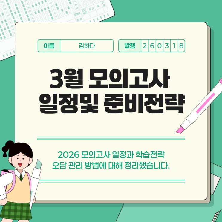 안녕하세요. 하다학원입니다. 새 학기의 설렘이 가득한 3월입니다. 우리 고등부 학생들에게 3월은 단순한 시작 그 이상의 의미가 있죠. 바로 2027학년도의 첫 전국연합학력평가가 기다리고 있기 때문입니다! 3월 모의고사는 단순한 모의 시험이 아니라 학습 성과를 점검하고 현재 자신의 학업 위치를 전국 단위로 확인할 수 있다는 점에서 중요한 의미를 가집니다! 특히 고3에게는 본격적인 수능 준비의 출발점이며, 고2에게는 수능형 문제 적응을 확인하는 시험, 고1에게는 고등학교 시험 유형을 처음 경험하는 시험이기도 합니다. 우리 학생들이 완벽히 이해할 수 있도록 2026 모의고사 일정을 살펴보고, 3월 모의고사를 준비하는 고등학....... <img src="https://blogthumb.pstatic.net/MjAyNjAzMThfMjUw/MDAxNzczODIxMTAwOTUx.hdZrxqt81UF-Z5DXTzDgB-EeDWCsaPBUYcB_xcm4pdsg.xN-Cb1G_UUUOuF9L7V4mAcHMWSFAUiMzRfMQkSNgJqAg.JPEG/3%B8%F0_%B4%EB%BA%F1_%C7%D0%BD%C0%B9%FD.jpg?type=s3" />