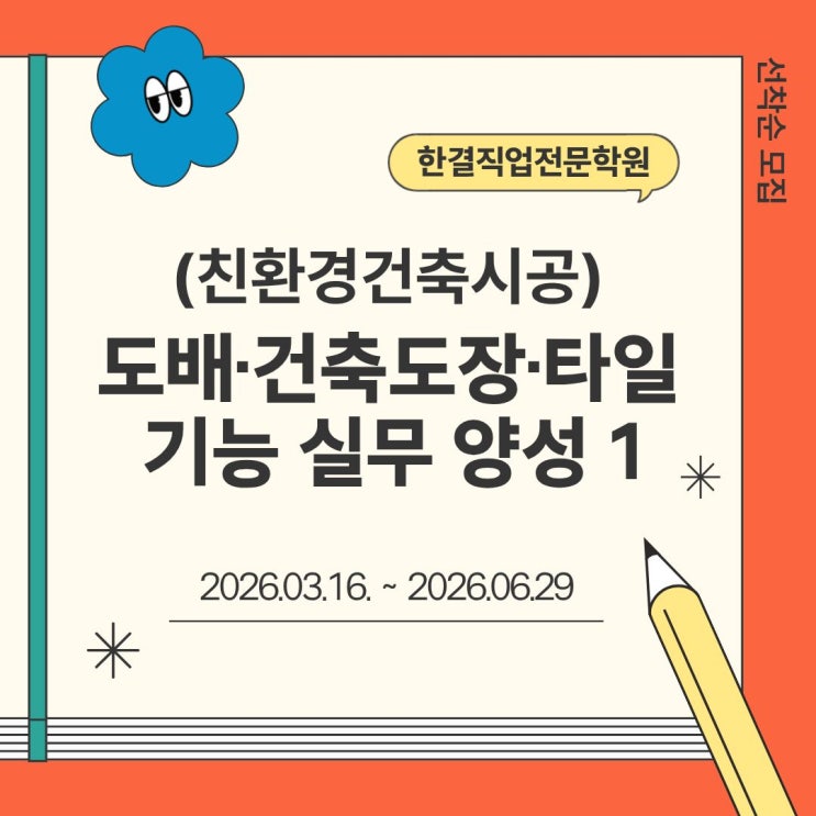 안녕하세요 한결직업전문학원입니다 벌써 추운 겨울, 설연휴도 다 지나고, 이제 정말 봄을 향해 가고 있네요! 오늘은 새로운 기술을 배우거나 자격증 취득을 고민하고 계신 분들을 위해 도배·건축도장·타일 기능 실무 양성 과정을 소개해 드리려고 합니다~ 해당 과정은 친환경건축시공 분야로 도배, 건축도장, 타일 기능을 실무 중심으로 배우는 훈련 과정입니다! 프로그램은 다음과 같이 운영됩니다. • 교육기간 : 2026.03.03. ~ 2026.06.16. • 교육시간 : 09:00 ~ 16:20 (일 7시간) (점심시간 12:00 ~ 12:40) • 총 훈련일수 : 72일 / 500시간 •교육장소: 대구 달성군 하빈면 하빈남로 504-3 • 훈련비 : 내일배움카드 소지 시 30만원 해당....... <img src="https://blogthumb.pstatic.net/MjAyNjAyMTNfMTc3/MDAxNzcwOTY1NDYzNzQx.sYB9qGzvdVXECCnRljbrtil5vqi49nnx1Pzz_QBg3C4g.HnvpZswmtkbVno-9rGoEUtOt78ljWFThIRYUYbKYQoAg.JPEG/1.jpg?type=s3" />