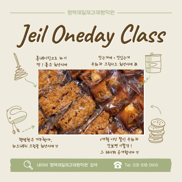 안녕하세요 '평택제일제과제빵학원' 입니다 ! 3월 원데이 클래스는 소규모로 진행이 가능할거 같아서 올립니다 :) 평소 홈베이킹을 즐겨하시거나 디저트를 좋아하시는 분들이라면 강추합니다 우리 학원의 비밀 레시피도 공개 할 예정이니 많은 관심 부탁드립니다 (뒷장도 꼭 읽어주시기 바랍니다) 문의❤️ 네이버톡톡 or Tel. 031 618 0410 오시는길 Insta. <img src="https://blogthumb.pstatic.net/MjAyNjAyMjVfMTc3/MDAxNzcyMDA2MzMyODI3.t1C1Mbwanuw4fvn4r_IomcKeTL6pvslHkOx8TsoUYHUg.EksCnYzQnKgFhK5REHl6JY7GYKtkmalAvujcUnuWNvEg.JPEG/2026_3%BF%F9_%BF%F8%B5%A5%C0%CC.jpg?type=s3" />