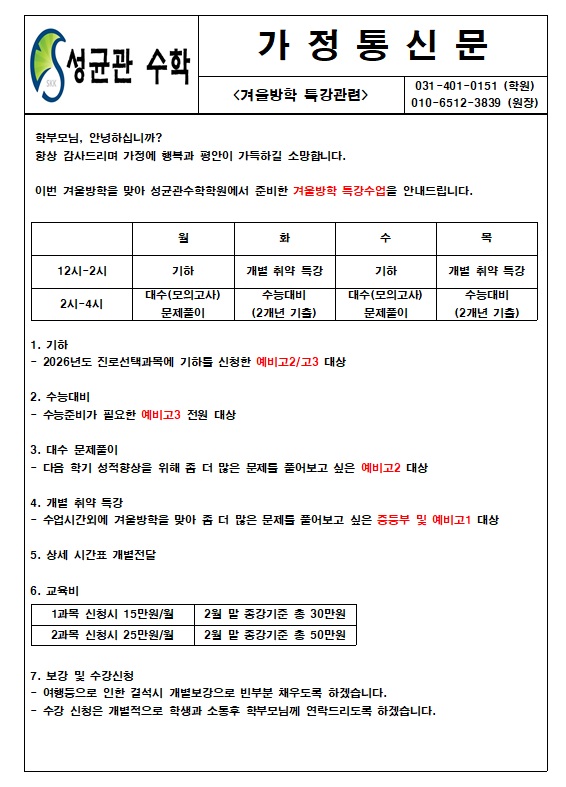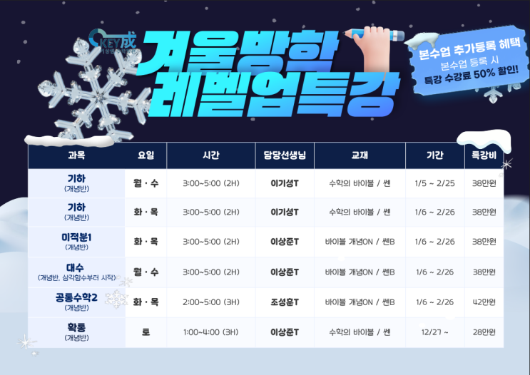 안녕하세요, 기성쌤수학학원입니다. 다가오는 겨울 방학에는 아무래도 마음 놓고 쉬기만은 할 수 없는 중요한 시기라고 생각이 됩니다. 공부에 욕심이 있는 학생들이라면 아무래도 이번 겨울 방학을 활용해서 더더욱 자신의 실력을 성장시키고 싶은 마음이 있을텐데, 그 성장을 저희 기성쌤수학학원 겨울 방학 특강과 함께 이루어 보시면 좋겠습니다. <img src="https://blogthumb.pstatic.net/MjAyNTEyMTVfOTgg/MDAxNzY1Nzk3NTg5MDYw.j7Mrs8_lhG8DymZsrRUp7vZ_HLi1Njcb9McHuPU779og.BSuXlkY9iqvGSoq_7a5nXF0tEI5t6vC4eRBAuNU89KUg.PNG/image.png?type=s3" />