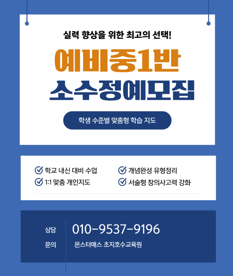 중등 수학, 기초부터 내신까지 몬스터매스 초지호수교육원 중등부 안내 중학교 수학은 ✔ 개념의 깊이가 달라지고 ✔ 학년이 올라갈수록 누적되는 구조로 인해 기초가 흔들리면 고등부까지 이어지는 학습 부진으로 연결되기 쉽습니다. 몬스터매스 초지호수교육원은 이러한 문제를 예방하기 위해 중등부 수업을 더욱 체계적이고 철저하게 운영하고 있습니다. 예비 중1반 개강 안내 많은 문의를 주셨던 예비 중1반을 개강합니다. 소수 정원(정원 4명) 학생별 수준과 진도에 맞춘 개별 진도 수업 중학교 수학에 꼭 필요한 개념 이해력 문제 해결력 학습 습관 형성에 집중합니다. 중등부 수업 운영 방식 ✔ 주 2회 개별 진....... <img src="https://blogthumb.pstatic.net/MjAyNTEyMjFfNjIg/MDAxNzY2Mjc0NDE4NTA2.SvHLma6d5IcLy6WqfGn_r9MNtxq9wkwG_VCULBmAk1Ag.S-ZGcn2zXdIaBfxKwCJ1lw8XnHqhV9cKE-MrCT8zdHEg.PNG/900%A3%DF%C6%C4%B6%F5%BB%F6_%B9%E8%B0%E6_%C7%D0%BB%FD_%C0%CF%B7%AF%BD%BA%C6%AE_%BF%B5%BE%EE_%B0%FA%BF%DC_%C8%AB%BA%B8_%C6%F7%BD%BA%C5%CD%A3%DF20251221%A3%DF084332%A3%DF0000.png?type=s3" />