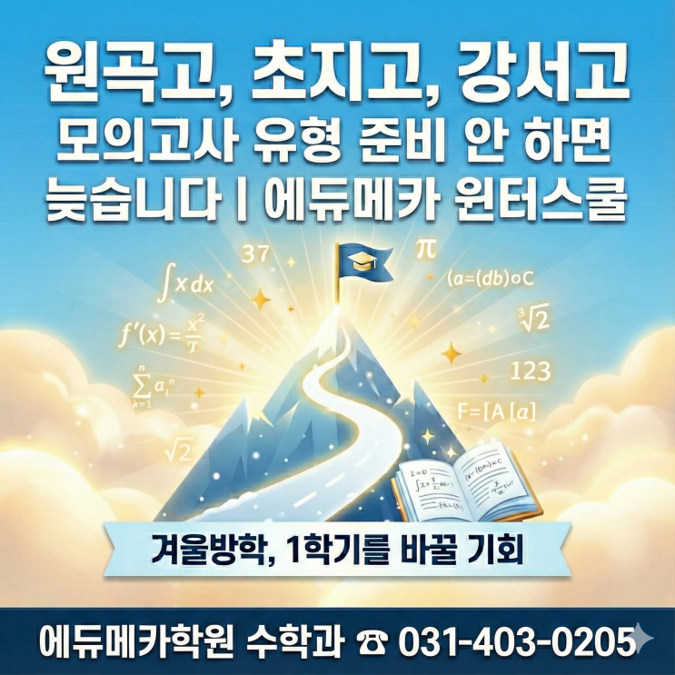 고등부 모의고사 유형, 겨울에 미리 준비해야 합니다 겨울방학은 단순히 진도를 빼는 시간이 아닙니다. 특히 고등부 수학에서는 “얼마나 먼저, 얼마나 제대로 준비했는가”가 1학기 성적을 거의 결정짓는 시기입니다. 에듀메카학원 수학과는 이번 윈터스쿨에서 고등부 모의고사 고난도 유형을 집중적으로 훈련하는 과정을 개설합니다. 왜 겨울에 ‘모의고사 유형’인가? 요즘 고등학교 내신 시험은 더 이상 교과서 문제만으로는 대비가 어렵습니다. 교과서 변형 문제 비중 감소 모의고사 변형·고난도 문제 비중 증가 처음 보는 형태의 문제 다수 출제 [▼ 현재 내신 시험 추세에 대한 이전 게시글 링크입니다 ▼] https://blog.naver.com/edumec....... <img src="https://blogthumb.pstatic.net/MjAyNTEyMjJfMjc3/MDAxNzY2MzI5NDM3Njcw.9B4pErhP3wzYy5uNYr-tFyj_8hNP39A1d1MzSYbV6kcg.1QzCGT8YBB1nrnZ0Ubjag9iqR6NqW1MLYBEVoZpoOkUg.PNG/Gemini_Generated_Image_1jq861jq861jq861.png?type=s3" />