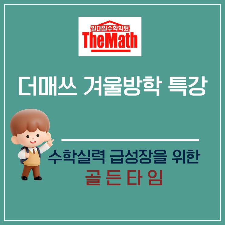 다가오는 겨울방학은 아이들의 학습 격차를 줄이고 실력을 확 끌어올릴 수 있는 절호의 골든타임입니다. 단단하게 기초를 잡고 실력을 업그레이드할 수 있는 아주 중요한 기회입니다. 평소에 진도 따라가느라 충분히 잡지 못했던 기본 개념, 응용 심화를 이번 겨울방학에 완전히 정리해야 합니다. 겨울방학은 단순히 쉬는 시간이 아닙니다. 이 시기를 어떻게 보내느냐에 따라 수학의 흐름이 선순환이 될 수도, 악순환이 될 수도 있습니다. 수학 겨울방학 특강이 필요한 이유 <약점 극복 및 보완> 학기 중에는 진도 나가기에 급급하여 미처 해결하지 못했던 개인의 취약한 개념이나 단원을 집중적으로 보완할 수 있습니다 1:1 또는 소수 정....... <img src="https://blogthumb.pstatic.net/MjAyNTEyMTJfMTE0/MDAxNzY1NDk4NjUxNjE5.iFZUo_t3I3Fh3ZijCzRleKUDKUhW6845uMifEe-iVTQg.YIoiW_8mdYyqFCZr0r7YxxxqiwcoiRKyLd_tqoCb4zkg.JPEG/%B4%F5%B8%C5%BE%B2_%B0%DC%BF%EF%C6%AF%B0%AD.jpg?type=s3" />
