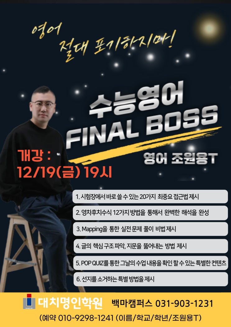 ✨영어, 절대 포기하지마! 수능영어의 FINAL BOSS - 조원용T 영어 대개강!!단순 암기 영어는 이제 그만! 수능 영어 10년 이상 전문 강의 노하우로 ‘외워서 푸는 영어’가 아닌 전략으로 푸는 진짜 수능영어를 만들어드립니다. ✔ 수능 실전 분석 + 실전모의 훈련 병행 ✔ 수많은 1등급을 만든 검증된 FINAL BOSS 커리큘럼 적용 수업의 특징 : 현강에 강한 특별한 영어 1. 시험장에서 바로 쓸 수 있는 20가지 최중요 접근법 제시 2. 영차후치수식 12가지 방법을 통해서 완벽한 해석을 완성 3. Mapping을 통한 실전 문제 풀이 비법 제시 4. 글의 핵심 구조 파악, 지문을 뚫어내는 방법 제시 5. POP QUIZ를 통한 그날의 수업 내용을 확인 할....... <img src="https://blogthumb.pstatic.net/MjAyNTEyMTNfMjg4/MDAxNzY1NjI1MDUyMjk2.ovNMBW0qzNieFh3yc4K3TsDgx_2p0qyna5EHaG6vtd8g.M3rE2YzHOlYEtVdDU3zW9fTdALXSPcuqyMzD0V_Oq_wg.JPEG/%C1%B6%BF%F8%BF%EB-001_%282%29.jpg?type=s3" />