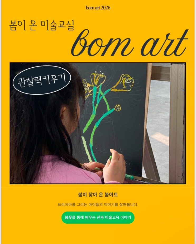 봄이 찾아온 교실, 아이들은 꽃을 ‘그리기’보다 ‘바라보기’부터 시작합니다. 3월, 봄아트에서는 프리지아 생화를 직접 관찰하며 사생 수업을 진행하고 있어요. 아이들은 눈앞에 놓인 꽃을 단순히 따라 그리는 것이 아니라, 꽃잎이 어디서 시작되고 어떻게 겹쳐지는지, 색이 어떻게 번지고 달라지는지를 천천히 살펴보았어요. 노란색 꽃이라고 해서 모두 같은 노란색이 아니라는 것, 봉우리에는 연두빛이 섞여 있고, 빛을 받는 부분과 그렇지 않은 부분의 색이 다르다는 것을 관찰하고 배워가며 스스로 발견해 나가는 과정이 무엇보다 중요합니다. 이 과정에서 아이들은 각자 다른 방식으로 표현을 이어갑니다. 어떤 친구는 수채화로 물의 농....... <img src="https://blogthumb.pstatic.net/MjAyNjAzMThfMjIw/MDAxNzczODE4MzgxOTE5.44U2it3hlnS2LVWyPBaCBOnyW-Z0AhzjGrhgPCqY-18g.3tYkj3ceomKkjYNkfVqQz0eNkKkwnsWAjaotTrjo7Qkg.JPEG/KakaoTalk_Photo_2026-03-18-16-19-26_001.jpeg?type=s3" />