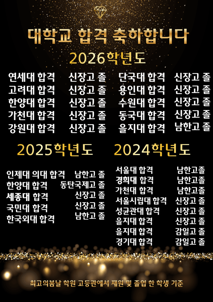 하남 신장동 영어수학 전문 학원, 2026학년도 재학생 대학 합격 결과 2026학년도 대학 입시가 마무리되었습니다. 하남 덕풍동/ 신장동에 위치한 최고의봄날 영어수학 전문 학원에서는 올해도 재학생 기준 우수한 대학 합격 결과를 만들었습니다. 이번 결과는 단기 특강생이 아닌 고등관 재원 및 졸업생 기준 성과입니다. ⸻ 2026학년도 주요 합격 대학 • 연세대학교 합격 (신장고 졸) • 고려대학교 합격 (신장고 졸) • 한양대학교 합격 (신장고 졸) • 가천대학교 합격 (신장고 졸) • 강원대학교 합격 (신장고 졸) • 단국대학교 합격 (신장고 졸) • 용인대학교 합격 (신장고 졸) • 수원대학교 합격 (신장고 졸) • 동국대....... <img src="https://blogthumb.pstatic.net/MjAyNjAyMjZfNjkg/MDAxNzcyMDcyODk3MTIx.uP7-MAT9jyn0mFq3NMY_0wbFZkGcIjBdHBfiLtIMQDMg.TKYgKyZh1rDGQlnb73THAzk9QlIrtNiX_k5ABzAEF84g.PNG/IMG%A3%DF3770.PNG?type=s3" />