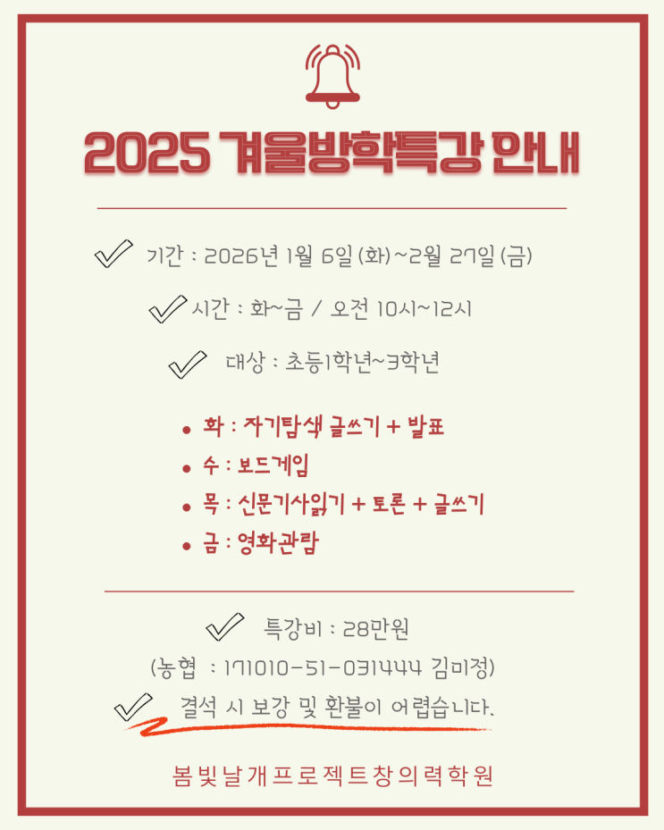 2025학년도 봄빛날개 겨울방학 오전 특강 안내 안녕하세요! 봄빛날개 프로젝트 창의력 학원입니다. 길고 긴 겨울방학을 맞아, 어린이들이 평일 오전, 의미 있는 시간을 보낼 수 있도록 초등 오전 특강 프로그램을 준비했습니다. 창의력과 논리적 사고력을 두루 키울 수 있는 알찬 특강 내용과 자세한 일정을 확인해 보세요! 겨울방학 특강 개요 요일별 특강 프로그램 (화~금 / 오전 10시~12시) 요일별로 아이들의 흥미와 사고력을 자극하는 다양한 주제의 활동이 진행됩니다. ✅ 화요일: 자기 탐색 활동: 자기 탐색 글쓰기 + 발표 목표: 자신의 생각을 정리하고 논리적으로 전달하는 능력 함양 ✅ 수요일: 보드게임....... <img src="https://blogthumb.pstatic.net/MjAyNTEyMTZfNDAg/MDAxNzY1ODY2NDY1MzE5.UOockWRpwpuK1bciLiyk89XJa_gjMMSAgsDLIbaHWRYg.-GYSKG53sjpZR_G6Qbhq--k9oHkVslN5A81TxLYpg3og.PNG/3.png?type=s3" />