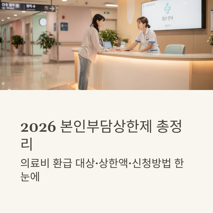 2026 본인부담상한제 상한액·환급금 조회 방법 총정리 병원비 많이 나오면 “이거 환급 받을 수 있나요?” 궁금해지죠. 그럴 때 꼭 알아야 할 제도가 바로 본인부담상한제입니다. 2026년 기준으로 대상, 상한액, 환급 방법까지 정리해볼게요. 본인부담상한제란? 건강보험 가입자가 1년 동안 낸 본인 부담 의료비가 일정 금액을 초과하면 초과 금액을 국민건강보험공단이 돌려주는 제도입니다. 과도한 의료비 부담을 줄이기 위한 장치 소득 수준에 따라 상한액이 다름 2026년 본인부담상한액 기준은? 상한액은 소득 분위별로 차등 적용됩니다. 예시 (연도별 변동 가능) 하위 소득 구간 → 낮은 상한액 중간 소득 구간 → 중간....... <img src="https://blogthumb.pstatic.net/MjAyNjAyMjZfMTE3/MDAxNzcyMDQxODIwODkz.tykFPJEgZRlwCTfKl34xierLhceKodYSMMaPXPFHTacg.z49qoCPbiQhW52UjiQsDeeQcouyF20g4fgCSWpAg-5kg.PNG/1_2026.png?type=s3" />