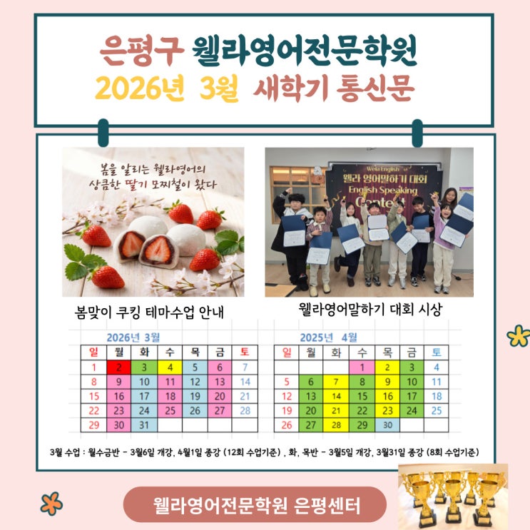 은평구 불광동 영어학원 웰라영어전문학원입니다. 2026년 3월 신학기 안내드립니다. 안녕하세요~! 따뜻한 봄과 함께 2026년 새 학기가 시작됩니다. 은평구 영어학원 웰라영어는 서울수리초등학교 불광초등학교 연천,연신 초등학교, 독바위 인근 학생들과 함께 새 학기를 준비하고 있습니다. 새로운 출발의 계절을 맞아 아이들과 활기찬 3월을 시작하려 합니다. 봄맞이 쿠킹 테마 수업 봄을 맞이하여 딸기 모찌 쿠킹 수업을 진행할 예정입니다. 재료는 모두 학원에서 준비하며 신학기 적응 이후 수업 시간 중 약 30분간 진행됩니다. https://blog.naver.com/englishbrain625/222265949566 아이들은 간식을 만들며 쿠킹 관련 영어 표현과 기초 어휘....... <img src="https://blogthumb.pstatic.net/MjAyNjAyMjZfMTY2/MDAxNzcyMTA0ODIwMjc2.ettsyyUjj0AmbwUCVffYMrUIQVpTtbGZ-Tpxuip2U30g.CMazTkoCOINTcEE1YN4I3aJqbqTufYl6EP4lV1YVyJYg.JPEG/2026%B3%E2-3_4%BF%F9%C5%EB%BD%C5%B9%AE-001_%282%29.jpg?type=s3" />