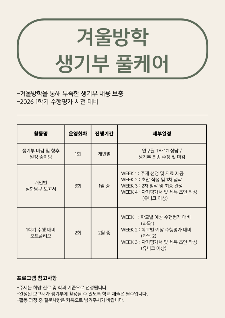 안녕하세요 여러분! 탐스입시전략연구소입니다. 어느덧 추웠던 겨울방학이 지나고, 개학이 코앞으로 다가왔습니다. 새롭게 고등학교에 입학하는 우리 고1 학생들, 이번 겨울방학은 어땠나요? 저희 탐스입시전략연구소에서는 고1이 되는 학생들이 학교에 입학하고 남들보다 더 수월하게 학교 생활을 시작할 수 있도록 알찬 활동을 진행했습니다. 12월 말 생기부가 마감되는 시점에서 우리 학생들과 개인별 줌미팅을 진행했습니다. 줌미팅에서 1년간 만들어온 생기부 포트폴리오를 점검하고, 향후 부족한 부분을 어떻게 보완하여 더 좋은 생기부를 만들어갈 수 있는지에 대해서 논의했습니다. 신입학을 앞둔 학생의 경우에는, 입학 전 평소 본인이....... <img src="https://blogthumb.pstatic.net/MjAyNjAyMjhfMTgw/MDAxNzcyMjg4MjEwNTk3.McJE0o7ifykfWRoQFiTZ9iBPWq2SBFu4F8EHFZBr4U0g.-WLvpLi68w42arXi3g_OI5fJprghu5_6_kAei5e1EEwg.PNG/image.png?type=s3" />
