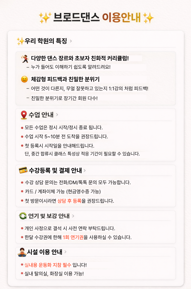 댄스학원 첫 방문, “초보인데 괜찮을까?” “수업을 따라갈 수 있을까?” “처음 가면 어떻게 시작하지?” 많이 궁금해하실텐데요! 그래서 오늘은 댄스학원을 간단히 안내드리려고 합니다 브로드댄스 이용가이드! 대부분, 댄스학원에는 춤을 엄청 잘추는 사람들이 다닐것이다 생각하지만 실제로는, '춤을 배워보고싶다' 라고 생각하신분들이 방문한답니다! 그래서 사실은 이런 분들이 많이 찾아오세요 ∨ 춤을 처음 배워보고 싶은 직장인 ∨ 취미로 스트레스를 풀고 싶은 분 ∨ 재미있게 운동을 하고 싶은 분 특히 “춤을 배워본 적이 없어요”라고 말씀하시는 완전 초보 분들도 많이 등록하고 계십니다. 처음 시작하는 분들이 많기 때....... <img src="https://blogthumb.pstatic.net/MjAyNjAzMTFfMTE1/MDAxNzczMjI1MzQzNTk3._MIGmkGmCvh1GTj21y-sM_Ag_yGyxSXJD72EnYmORAEg.QStlQpmYaHG4DIPCPwXrBeZKFt_Q-3EV25qeMvXEe4og.PNG/%C1%A6%B8%F1%C0%BB_%C0%D4%B7%C2%C7%D8%C1%D6%BC%BC%BF%E4._%2827%29.png?type=s3" />