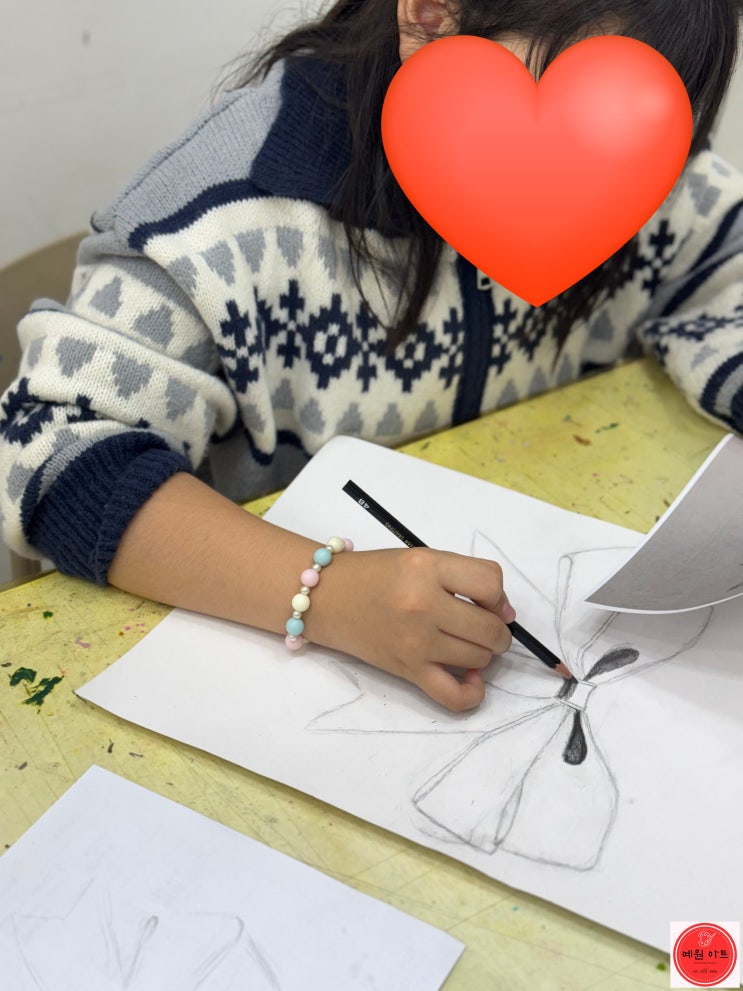 안녕하세요 예원아트입니다. 이번 시간에는 고학년 친구들의 멋진 작품을 포스팅해 볼게요. 이번 시간에는 형태 관찰 중심으로 표현해 보는 수업을 진행했습니다. 리본의 접히는 부분과 묶인 중심 구조를 먼저 이해하고 그려보았어요. 실제 리본도 묶어서 형태와 질감에 대해서도 이야기해 보았답니다. 가까운 부분은 연필 잡듯이 가깝게 잡고 묘사해 보자고 했어요. 빛이 닿는 부분과 어두워지는 부분을 구분하며 명암을 여러 번 쌓아 올려, 부드럽고 매끄러운 천의 느낌이 잘 드러나도록 지도했습니다. 그래서 어둠을 먼저 찾아서 점점 밝은 부분을 묘사해 보자 했어요. 마지막 단계에서는 연필을 더 가깝게 잡고 정확하게 정리하며 완성해 주....... <img src="https://blogthumb.pstatic.net/MjAyNjAyMjZfMjQz/MDAxNzcyMDg2ODUxMjkz.s5XAKZapBfcXH4UbO4UXYfC3WsBBFd0pkaZ0VRhyBsgg.IW-rYD02MKGuiJblEpu8rUILqKHwfPYDZccHsCyfgqcg.JPEG/KakaoTalk_20260130_160438372_14.jpg?type=s3" />