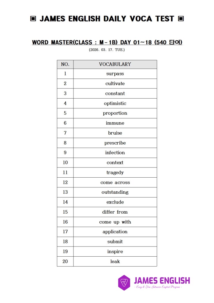 우리학원, 현재 중학교 1학년 B반의, 오늘 단어테스트 본 내역과, 담시간 숙제목록을 공개한다. 우선, 단어는 누적테스트로, 매일매일 새로운 단어에, 기존 단어까지 셤을 본다. 그리고, 담시간 숙제목록은, 아이들이 집중해서 하면, 매일 1시간 ~ 2시간 정도 소요되는 분량이다. A반과 더불어, B반도 아주 최선을 다해 열심히 하고 있다. <img src="https://blogthumb.pstatic.net/MjAyNjAzMTdfMTQw/MDAxNzczNzM4ODQ2NTg1.kHZDb2vdcwWaGV0D2vNCpMEew8yv7FkL4a8gLLuARnIg.z_NRHcG1jJBHcHT6m3xSUoDCpLceGBs7tijJdfSXcx4g.JPEG/%BF%F6%B5%E5%B8%B6%BD%BA%C5%CD%28%C1%DF%B5%EE%B0%ED%B3%AD%B5%B50118%29001.jpg?type=s3" />