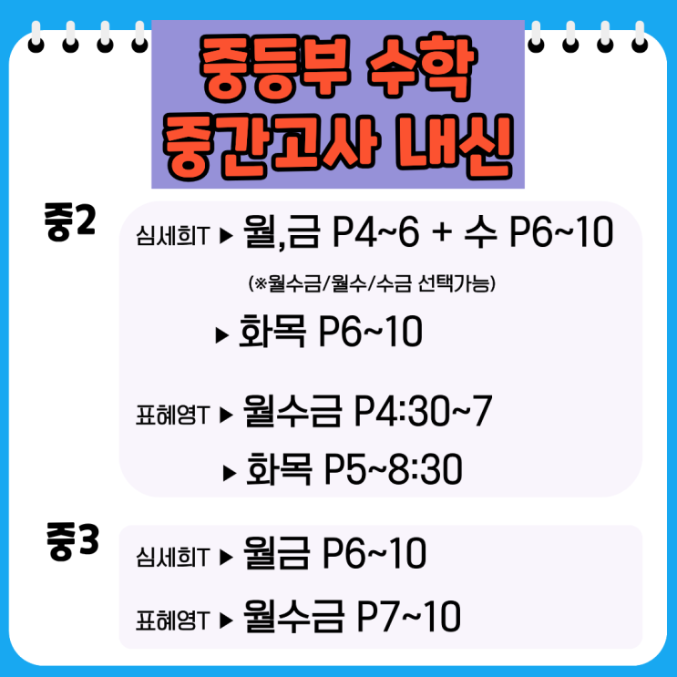 중등부 수학 1학기 중간내신대비 시간표