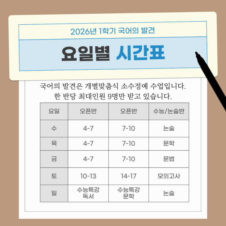 안녕하세요~ 국어의 발견입니다. 오늘은 2026년 1학기부터 여름방학 전까지 시간표 안내를 드리려 합니다. 저희는 개별맞춤식 수업제를 원칙으로하고 있으며 소수정예이기에 오픈반 하나당 최대 6-9명 정도의 인원만 수용하고 있습니다. 수/목/금 오픈반과 수능/논술반(고3 및 N수반) 수업을 진행하고 있습니다. 국어의 발견은 무엇보다 학생들이 부담스럽지 않게 즐겁게 학원에 오는 것을 모토로 삼고 있습니다. 최소한의 숙제와 시간으로 최대 효율의 성적을 내는 것, 국어의 발견의 목표입니다. 시험기간에는 잠시 즐거움과 멀리하고 공부에 집중한다면 A등급 정도야 껌이겠죠 ㅋㄷㅋㄷ 새학기를 맞아 국어 학원 고민하시는 분들 언제건 상담....... <img src="https://blogthumb.pstatic.net/MjAyNjAyMjZfMTk5/MDAxNzcyMTA0NTIyNDIx.pRFHHW5dSAGm0PLCj7WFBqazXq32hTMxiS_CiY0UhBUg.0RiJNRvsm_DbG2-kgFpnMfT2ASC4XeEBwE64GYzJYhMg.PNG/2.png?type=s3" />