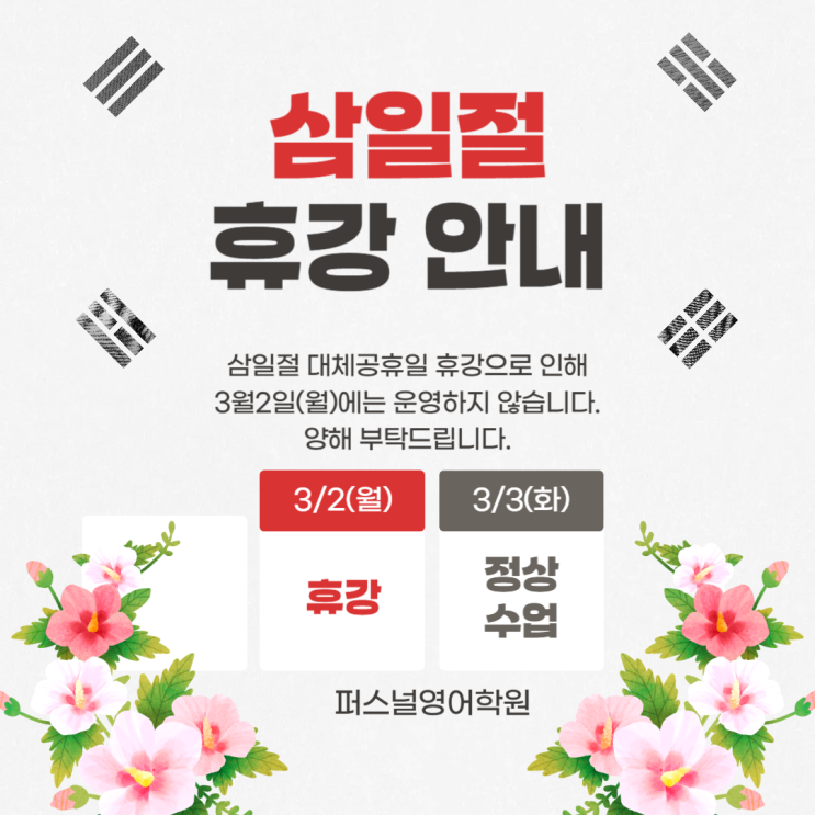 안녕하세요, 퍼스널영어입니다. 삼일절 휴강 일정을 안내드립니다. 3월 2일 (월) 휴강 3월 3일 (화) 정상수업 수업일정 참고하시고 문의는 학원으로 연락주시면 됩니다. 감사합니다 <img src="https://blogthumb.pstatic.net/MjAyNjAyMjVfMTk2/MDAxNzcyMDExMzM2MjYw.pmhiEQswQdMdYONJxbdBuHw_nqb-pm8OOYwJt_R1Exsg.4d0JRTR9ii72ckaDgu-pRmFaK1PiL3Pk4Nx6JUmq5A0g.PNG/%C1%A6%B8%F1%C0%BB_%C0%D4%B7%C2%C7%D8%C1%D6%BC%BC%BF%E4_-001.png?type=s3" />