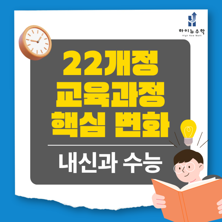 수능과 내신은 늘 조금씩 변해왔습니다. 하지만 22개정교육과정은 그 변화의 폭이 꽤 큽니다. 특히 내신 등급 체계와 수능 과목 구조가 동시에 달라지면서 학습 전략을 처음부터 다시 생각해야 하는 시점이 되었습니다. 제도 변화는 결국 공부 방법의 변화를 요구합니다. 그리고 그 중심에는 언제나 수학적 사고가 있습니다. 안녕하세요. 부산 강서구 명지동에 위치한 하이뉴수학학원입니다. 저희는 단순한 문제 풀이가 아니라 개념 이해와 문제 해결 능력 강화를 목표로 지도합니다. 오늘은 22개정교육과정의 핵심 변화와 그 안에서 수학이 어떤 의미를 갖는지 차분하게 정리해보겠습니다. 22개정교육과정은 단순히 교과서가 바뀌는 수준이 아닙....... <img src="https://blogthumb.pstatic.net/MjAyNjAyMjdfMTIx/MDAxNzcyMTUzNjA4Mjky.a9pfAum43Y7bBr2QrRJn__FinRdGVPm08_vGuBkRspMg.kIZn7nG6a5GS9bgvIqGqHLYDMoQeG4GKpzQrzCBUQyIg.PNG/22%B0%B3%C1%A4%B1%B3%C0%B0%B0%FA%C1%A4_%BD%E6%B3%D7%C0%CF.png?type=s3" />