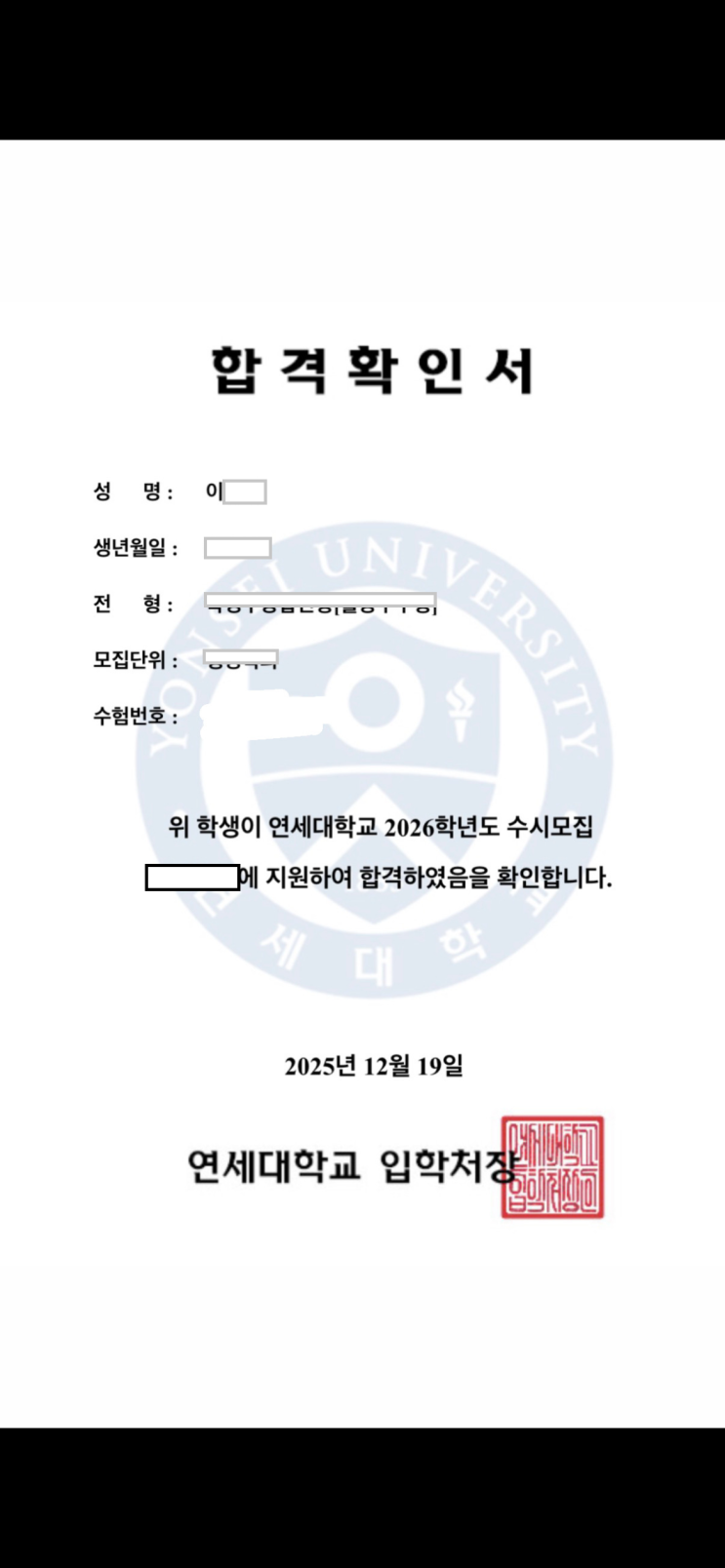 2026학년도 합격 소식 전합니다.(연세대,고려대)