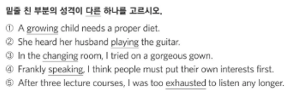 그래마존 기본편1 고등문법 CH 16 분사 편 *현재분사(-ing)**와 **동명사(-ing)**를 구별하는 전형적인 문법 문제입니다 이 문제의 핵심은 '-ing'가 '하고 있는(분사)'의 의미인지, '~하기 위한 용도(동명사)'인지를 구분하는 것입니다. ① A growing child (현재분사) 해석: 자라고 있는 아이 설명: 명사(child)의 상태나 동작을 직접 수식합니다. 아이가 직접 자라는 동작을 하고 있으므로 현재분사입니다. ② heard her husband playing (현재분사) 해석: 남편이 연주하고 있는 것을 들었다 설명: 지각동사(heard)의 목적격 보어로 쓰여, 남편이 연주라는 동작을 진행 중임을 나타내는 현재분사입니다. ③ In t....... <img src="https://blogthumb.pstatic.net/MjAyNjAyMjZfMTkz/MDAxNzcyMDg0NjIwMTc1.HgbDSKkI3Lio1ptH6iwjQUFHjovgyszeQgkimdCEX5gg.aebMhMhLkDxzMNWB7jk9erQddrv-rvALWq9KadS3lMcg.PNG/image.png?type=s3" />