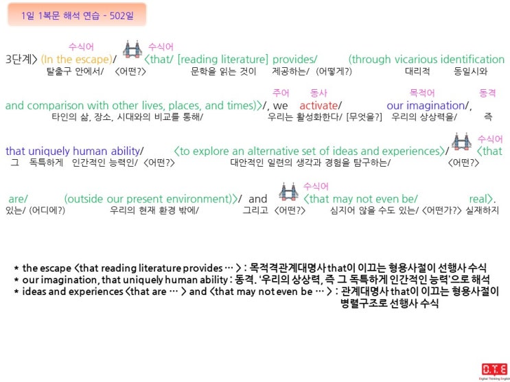 진짜 실력은 복문을 시각화하여 이해하는 능력에서 차이가 난다. 하지만, 아무리 복잡한 문장이라도 어차피 하나의 문장은 default option과 같은 주절은 반드시 있어야 하며, 주절이 아닌 종속절은 명사절, 형용사절, 부사절 중 하나로 쓰일 뿐이다. 복문을 대할 때, 한 눈에 주절과 종속절을 구분할 수 있는 안목을 키우는 것이 1일 1복문 해석연습의 지향점이다. ******************************* 1단계 : 주절과 종속절 한 눈에 구분하기 연습 모든 문장은 반드시 하나 이상의 주절(main clause)이 있어야 하며, 이는 종속절(명사절, 형용사절, 부사절) 중에서 하나를 선택하지 않으면 자동으로 선택되는 default option처럼 반드시 쓰여야 하....... <img src="https://blogthumb.pstatic.net/MjAyNjAyMjZfMjI5/MDAxNzcyMDYwNTMyNjAz.7AtdY12y-Q0Yjf4aTRi7XQRwnqoF_FmLPVH_NwFvOxMg.C00nxesJOO9xjknay2Zlvjk7KT78_O4Rztf4CuwpWSQg.JPEG/1%C0%CF_1%BA%B9%B9%AE_%C7%D8%BC%AE_%BF%AC%BD%C0_-_502%C0%CF_2.jpg?type=s3" />