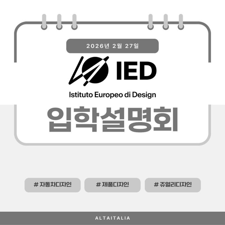 IED 입학 설명회 안내 이탈리아를 대표하는 예술·디자인 교육기관인 Istituto Europeo di Design (IED) 는 로마, 피렌체, 밀라노, 베네치아, 토리노, 칼리아리 등 주요 도시에 캠퍼스를 두고 있습니다. 이탈리아 내에서 가장 규모가 큰 디자인 교육기관 중 하나로 평가받고 있으며, 올해로 설립 59주년을 맞이했습니다. 국내에서도 ‘아이디(또는 이에드)’라는 약칭으로 많이 알려져 있으며, 다수의 한국 졸업생들이 자동차 디자인, 쥬얼리 디자인, 패션, 제품 디자인, 산업디자인, 시각디자인, 순수미술, 무대미술, 디자인 매니지먼트 및 비즈니스 분야에서 활발히 활동하고 있습니다. 2월 27일 IED 입학 설명회 일정 일시: 2월 27일 (금....... <img src="https://blogthumb.pstatic.net/MjAyNjAyMTFfMTQy/MDAxNzcwNzcyOTYzODA1.uX_hMzclJXmL3stlvO1vJRqZIyW0KuDJQxE56ruIzHwg.RiHwEVJZAhIu4mw8fIP3v7eLGdtMuxIA80tff36Dwusg.JPEG/%C1%A6%B8%F1%C0%BB_%C0%D4%B7%C2%C7%D8%C1%D6%BC%BC%BF%E4._%282%29.jpg?type=s3" />