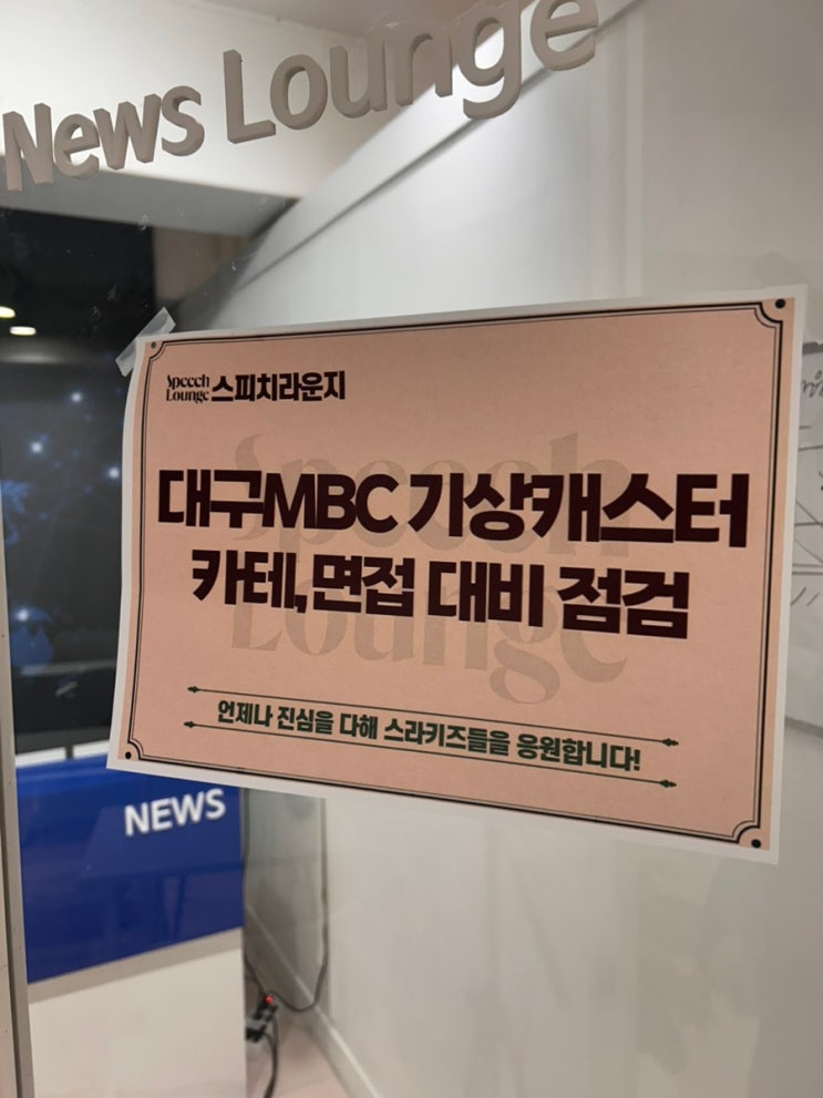 오늘은 대구MBC 기상캐스터 시험이 있는 날이예요! 요즘 기상캐스터 시험에서도 울 스라 친구들의 기세가 아주 좋은데요! 각자의 매력과 진정성을 보여주기 위해 쌤들의 노하우를 아낌없이 풀어내며 1:1 맞춤 점검을 이어갔어요 "빈약했던 답변이 더 풍성해져 고급스러워졌어요" "쌤 덕분에 방향성을 제대로 잡았어요" 등등 이번 점검을 통해 스라 점검만의 특별함을 느꼈다는 이야기를 학생들이 전해줬는데요 "합격"을 향한 샘들의 진심이 울 아그들과 같기에 샘들도 늘 점검 때마다 고민을 참 많이 한다는 사실! 우리 아그들 각자의 매력을 최고로 끌어주기 위한 쌤들의 노력이 우리 아이들에게 잘 닿은 것 같아....... <img src="https://blogthumb.pstatic.net/MjAyNjAyMTJfNzgg/MDAxNzcwODczMTA1ODM1.Sc-336gdYgf1U587QAsQjmqhuPqsqjpB007B3lioS4Ag.cdIT9wVUSU8fLvf8ZyJLaRsTuXvRd_i7ujdT1r2pHP8g.JPEG/IMG%A3%DF0314.jpg?type=s3" />