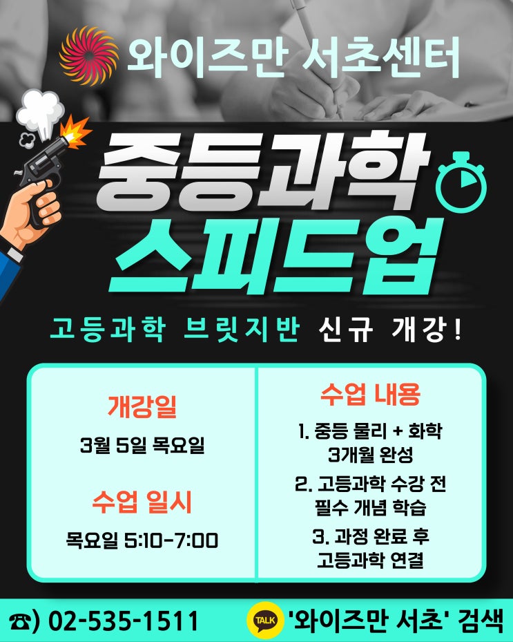 와이즈만 서초센터 고등과학 브릿지반 3월 개강 안내! 안녕하세요 와이즈만 서초센터입니다^^ 3월 새로운 과학 수업을 소개합니다. 과학 선행 수업 or 영재입시 대비 등 다양한 이유로 과학 진도를 빠르게 나가야 하는 학생들을 위해 준비했습니다. 고등과학 선행학습을 원하는 학생에게는 학습의 기본 토대를 만들어줄 수 있고, 영재입시를 목표로 빠르게 고등과학 학습을 시작해야 하는 학생들에게는 꼭 필요한 내용들을 빠르게 진행하여 고등과학 학습의 시작을 앞당김으로써 고등과학을 반복학습 할 수 있는 환경을 만들어 주는데 시작점이 됩니다. 와이즈만 서초센터와 함께 시작하는 고등 브릿지 과학 수업! 바로 신청하세요. 고등과학 시....... <img src="https://blogthumb.pstatic.net/MjAyNjAyMTJfODQg/MDAxNzcwODkyMTQ0NjE3.7XeqgcJF_z69P5hnZ98elEkSj55x9IWG88jZmNuyG_gg.Itz5Moq4BI-Mm6d4_sR44BgEG3yxeDAtZjlSQLzDbdEg.JPEG/%B0%ED%B5%EE%BA%EA%B8%B4%C1%F6%B9%DD_%C6%F7%BD%BA%C5%CD.jpg?type=s3" />