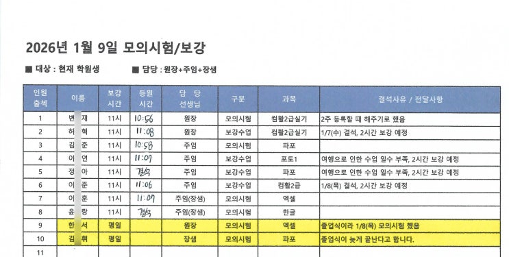 1/9(금) "ITQ 모의시험 및 보강수업" 결과 보고 안녕하세요~ 한국사회컴퓨터학원입니다. 저희 학원은 매월 둘째, 넷째 금요일 "모의시험 및 보강수업"을 진행하고 있습니다. 1. 모의시험 시험 전날, 시험장과 같은 분위기로 모의시험을 실시하여 학원생들이 시험 당일에는 긴장하지 않고 학원에서 연습한대로 편하게 응시할 수 있도록 하고 있습니다. 2. 보강수업 공휴일, 연휴, 학원휴가 등의 이유로 수강기간까지 최소 수업시간(16시간)이 안되는 경우 보강수업을 진행하고 있습니다. 개인 사정에 의한 결석은 해당되지 않습니다. 3. 모의시험 및 보강수업 시간에 대한 공지 https://blog.naver.com/handamen/224021469276....... <img src="https://blogthumb.pstatic.net/MjAyNjAxMTBfMTA1/MDAxNzY4MDA1NDU4Nzky.0MasFlAbsG9rLhcAMKAE1P4orI69ild8-Fa8VJ7LdTkg.8zytb4X-6oEbEQrN5R6meHGOPaaR-3RfdDez6A0DNyMg.JPEG/KakaoTalk_20260109_111049752.jpg?type=s3" />