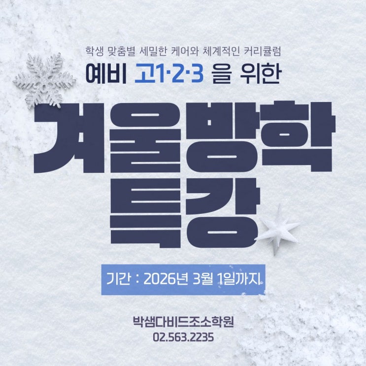 안녕하세요 박샘다비드조소학원입니다. 2026년이 시작되었습니다. 새해 복 많이 받으세요. 각대학들은 이제 정시 실기고사가 시작되는 시기입니다. 우리 예비 고3,고2학생들은 어느덧 겨울 방학을 맞이했을 시간이고, 중요한 이 겨울방학시즌을 어떻게 보낼지, 계획은 잘 준비되어 있나요? 학년이 곧 바뀌는 시기인 겨울 방학은 아주 중요한 시간이예요. 겨울방학은 단순한 ‘쉬는 시간’이 아니라, 방향을 정비하고 다음 단계를 준비하는 전환의 시기입니다! 긴 시간처럼 느껴지겠지만, 사실 3월부터 시작하는 학기 준비는 짧은 시간이예요. 이 시간의 선택과 밀도가 실력과 결과에 분명한 차이가 만들어집니다. 박샘다비드조소학원에서는 1월부....... <img src="https://blogthumb.pstatic.net/MjAyNjAxMDdfMjcz/MDAxNzY3Nzc0NDA2MDE5.SMoZqZghTnrvn_JX8X0fwKaP_brxt7uSkj7FzfQhLtsg.x6KX4-V5xzNyDEOJErwE7gN5kZRcNZZfPd0AzlQRYZQg.JPEG/%B0%DC%BF%EF%B9%E6%C7%D0%C6%AF%B0%AD%C0%CC%B9%CC%C1%F6.jpg?type=s3" />