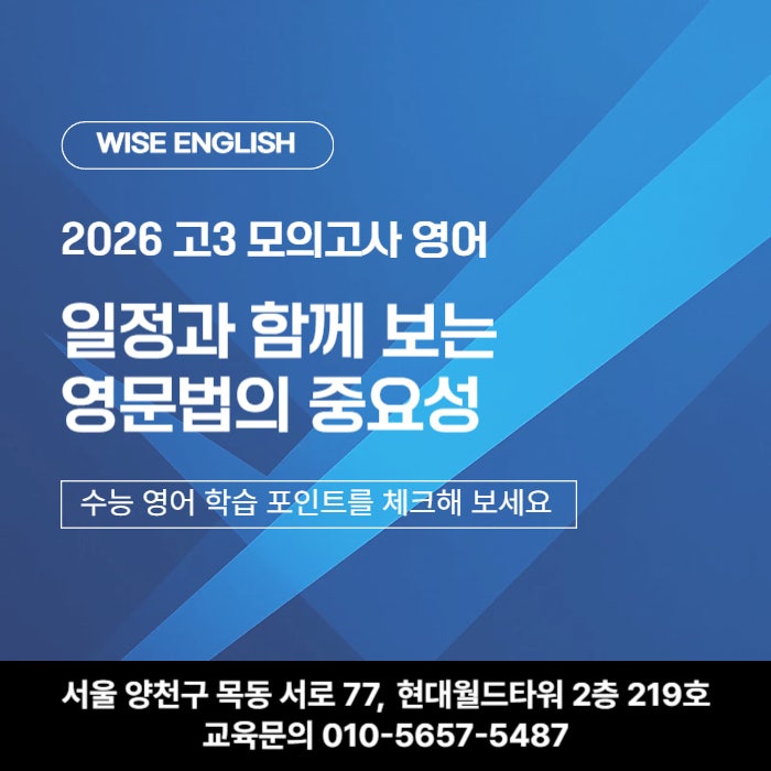 안녕하세요. 양천구 목동에 위치한 와이즈영어는 단순한 문제 풀이가 아니라, 학생 눈높이에 맞춘 맞춤 지도와 이해 중심 수업으로 차근차근 실력을 쌓아가며, 영어에 대한 자신감과 흥미를 함께 키울 수 있는 환경을 만들어 줍니다. 수능 영어를 준비할 때 많은 학생들이 먼저 떠올리는 것은 단어와 독해입니다. 실제로 문법을 직접 묻는 문제는 많지 않아 보여 우선순위를 뒤로 미루는 경우도 있지요. 하지만 영어는 결국 문장을 읽고 의미를 정확하게 이해하는 과목입니다. 문장의 구조를 제대로 보지 못하면 해석은 쉽게 흔들릴 수밖에 없습니다. 그래서 와이즈영어는 독해 실력을 안정적으로 키우기 위해서도 문법의 기초가 꼭 필요하다고 봅....... <img src="https://blogthumb.pstatic.net/MjAyNjAzMjBfMSAg/MDAxNzczOTY5OTU1NTg5.22WpzY9xdlFCKGJKbWve9SCxkrl298JyVQJBdviu338g.139wXgFQnKWInsAI_AfI-Ev4WOvn-uR6qvXjTngiLrcg.JPEG/%B8%F1%B5%BF2%B4%DC%C1%F6_3%B4%DC%C1%F6_5%B4%DC%C1%F6_%BF%B5%BE%EE_%281%29.jpg?type=s3" />