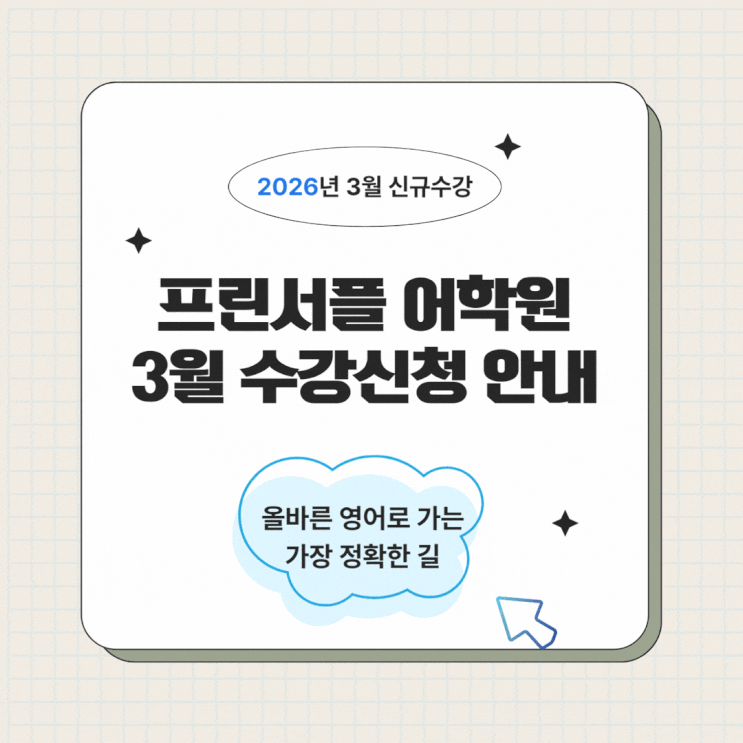 꽃샘추위가 지나가고 창가에 따뜻한 볕이 드는 3월이 오고 있어요! 이런 날씨가 되면 왜인지 우리의 마음에도 기분 좋은 설렘이 찾아오고는 하죠. 새 학기 가방을 메던 그 시절처럼 무언가 다시 시작하고 싶고, 더 나은 내가 되고 싶은 마음이 생겨난달까요? 하지만 한편으로는 마음 한구석이 조금 무거우실지도 몰라요. “벌써 3월인데, 올해 영어 공부는 시작도 못 했네.” “남들은 벌써 저만큼 앞서가는 것 같은데…” 같은 생각을 하시면서요. 하지만, 여러분! 1년마다 새해가 찾아오는 것처럼, 1달마다 매번 새로운 달이 시작되지 않나요? 무엇인가를 시작하기 좋은 시간은 꼭 '1월'이 아니어도 돼요. 여러분들이 진심으로 마음....... <img src="https://blogthumb.pstatic.net/MjAyNjAyMjRfMTc0/MDAxNzcxOTE0MDE2NzYy.eER-3Z4NYtzS0AdotCHnhUMPGcBb5riWLPDFJ641fkEg.uazOvBFokuV8orFjDbdSiZ1OFwlWK2Z5KM2V5BdfhIcg.GIF/%C7%C1%B8%B0%BC%AD%C7%C3_%BE%EE%C7%D0%BF%F8_5%BF%F9__%282%29.gif?type=s3" />