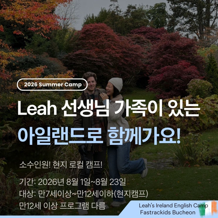 FTK부천원의 Head 선생님이였던 Leah선생님이 계시는 아일랜드로 이번 여름 캠프를 출발합니다! Leah 선생님이 현지 총괄 관리해주는 소수정예 특별캠프이기에 캠프비용은 낮고 프로그램의 퀄리티가 높습니다. 신원조회 마친 Leah선생님이 관리하는 홈스테이 가정에서 현지 가족들과 생활하며 국제학생들이 거의없는 현지 아이들로 구성된 로컬 캠프를 2주간! 1주는 현지 아이들에게도 인기가 많아 신청하기 어려운 현지 스카우트 대원 활동을 1주간 합니다. 매일 방과후에는 도서관에서 영어독서 및 글쓰기 시간을 가지고 매주 2회 현지 초등학교 선생님의 특별수업도 받습니다. 우와! 아일랜드는 직항이 없고, 항공권 비용이 200정도 예상됩니....... <img src="https://blogthumb.pstatic.net/MjAyNjAyMjhfMjc5/MDAxNzcyMjQ0OTQwODA3.pA2GXxVB9IY9T5l-o6jQj2d7CRKE7jC1jiNMGx7TnMUg.0qubFsgMdoxSrNa8aDzuh--C4LBPxqLsNbDau-Ihq4og.JPEG/1.jpg?type=s3" />